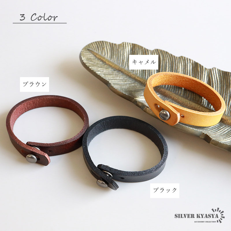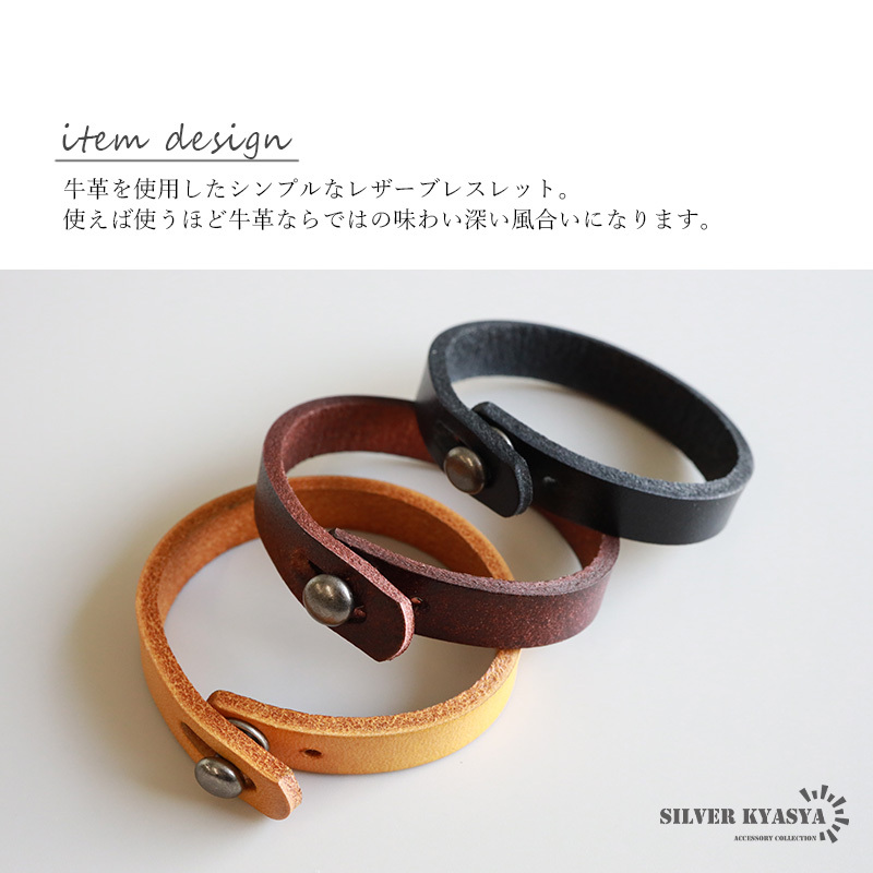 商品概要 | ■ITEM DETAIL 牛革を使用したシンプルなレザーブレスレット。使えば使うほど牛革ならではの味わい深い風合いになります。 ■3カラー展開 ブラック、ブラウン、キャメル、普段使いしやすい3タイプを取り揃えております。 |