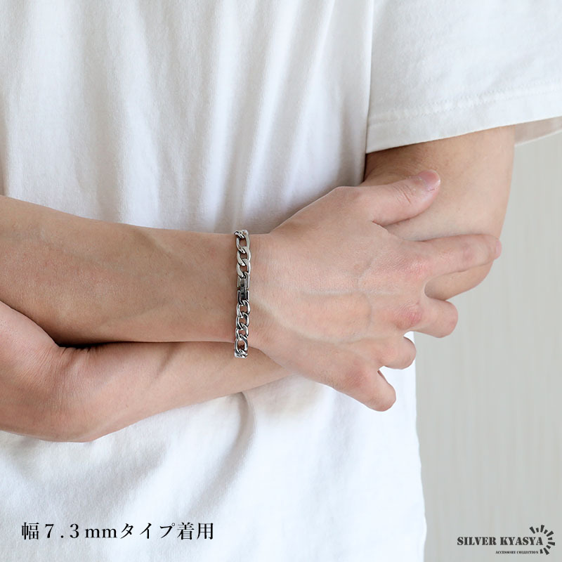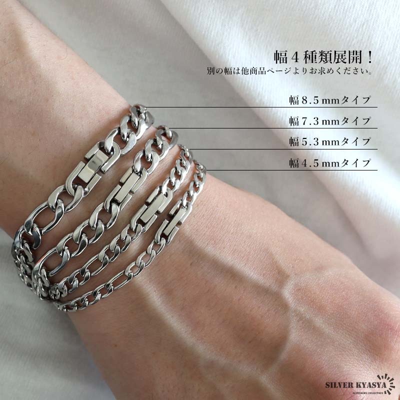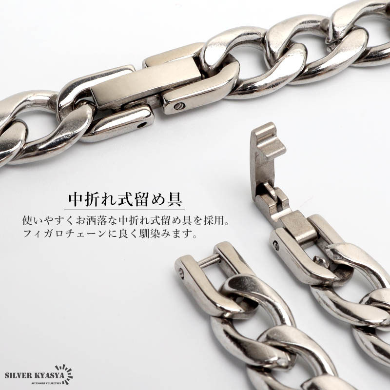 大小のコマを連ねたお洒落なフィガロチェーンブレスレット。幅7.3mmでゆとりのあるコマが特徴のフィガロチェーンを採用し、軽やかでこなれた雰囲気を演出します。