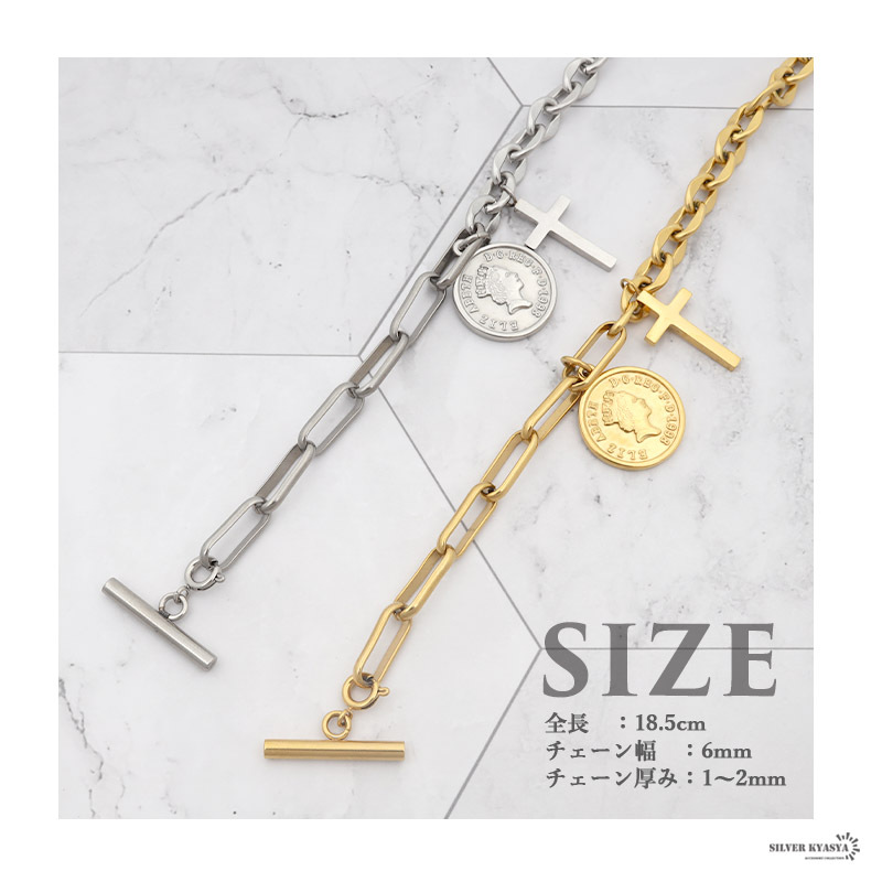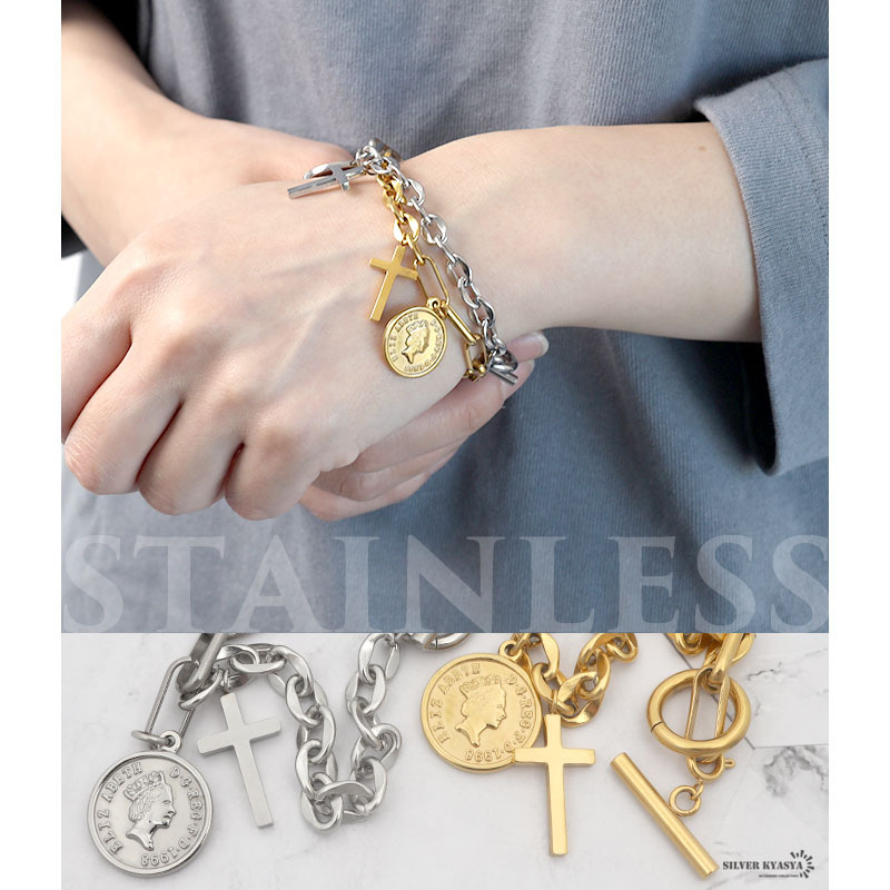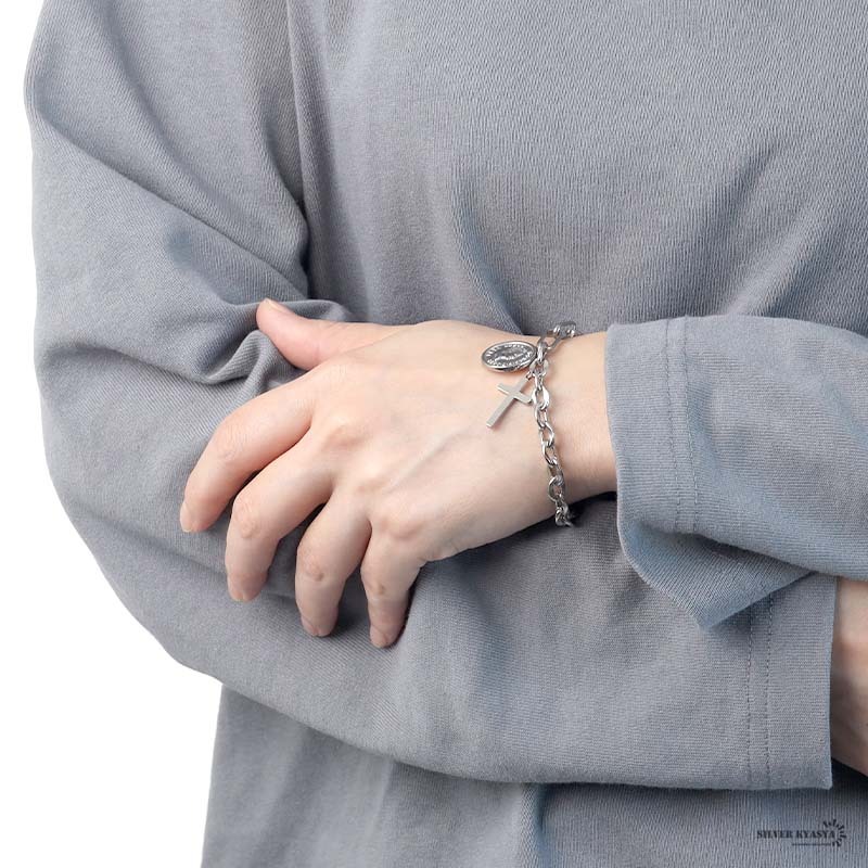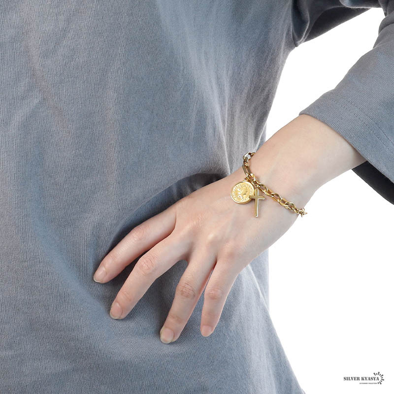 チャームが揺れる、2種類のチェーンを使用したブレスレット。