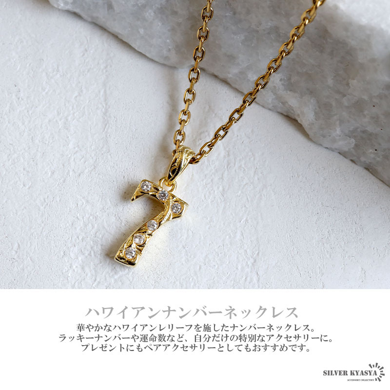 華やかなハワイアンレリーフを施し、ジルコニアを据えたナンバーネックレス。ラッキーナンバーや運命数など、お好きな数字を選べば、自分だけの特別なアクセサリーになること間違い無し!大切な人への贈り物にもぴったりのアイテムです。