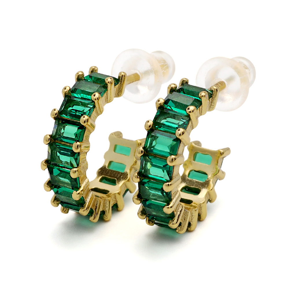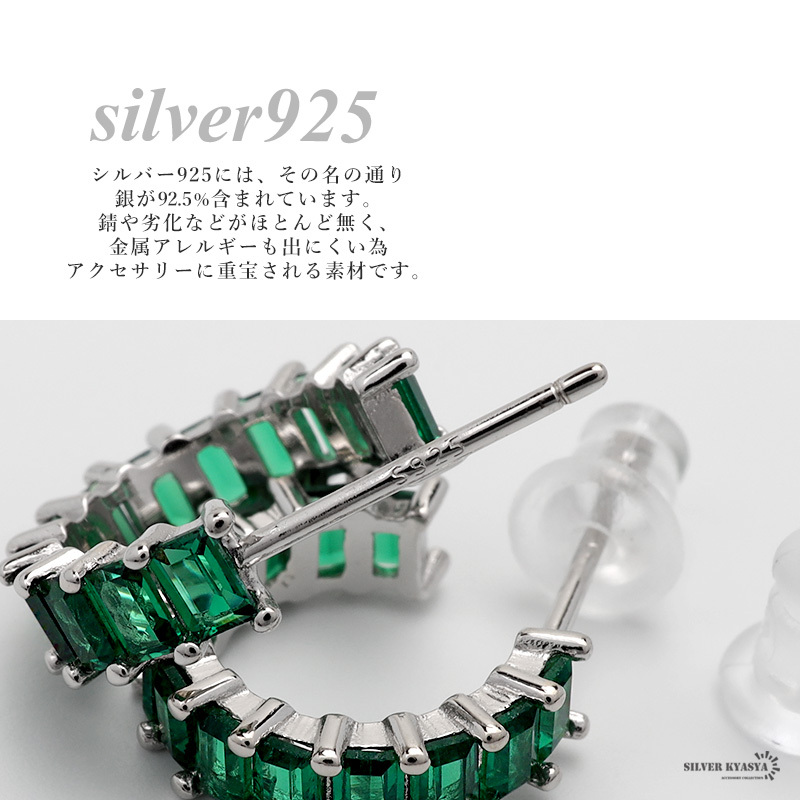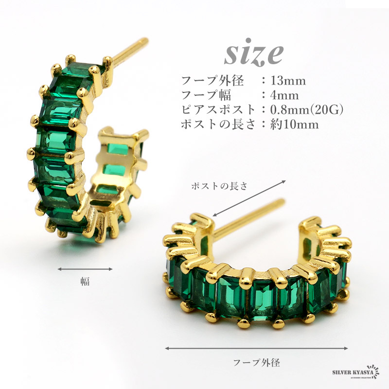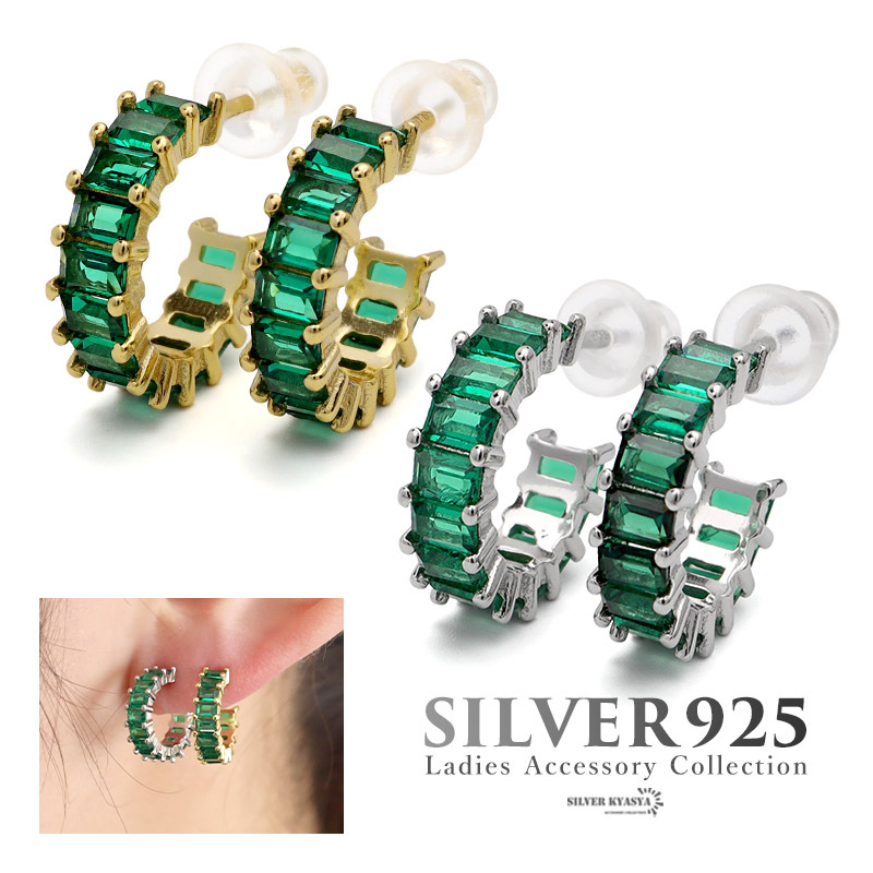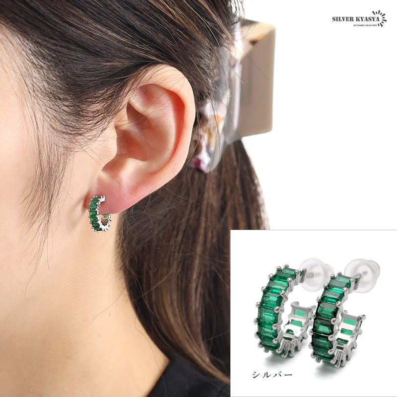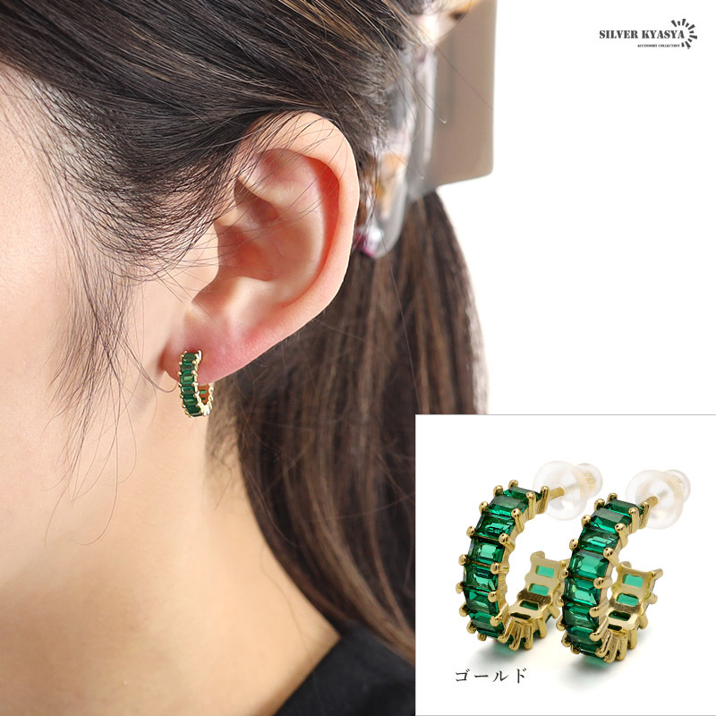 スクエア型のキュービックジルコニアを贅沢にあしらった上品なフープピアス。落ち着いたグリーンのストーンが大人な女性らしさを演出します。