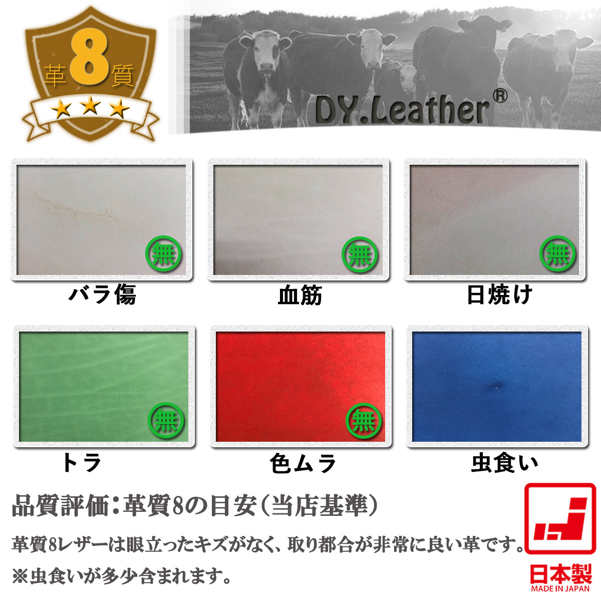 | 品質詳細 | 革質:[低 1-2-3-4-5-6-7-(8)-9-10 高] ツヤ:[無 (1)-2-3-4-5 有] 厚み:[1.5mm] |