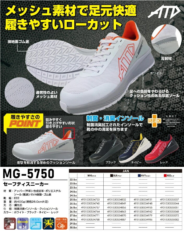 喜多 KITAMG5750※販売はタイトルの商品です。-----メガセーフティ TOP FORMシリーズ-----・つま先部鋼先芯ガード入りのセーフティシューズ・EVA厚底ミッドソールを採用し足をしっかりホールドするシューレース仕様・グリップ力を高めるため靴底全面にラバー(ゴム)を配置・アッパーデザインは、メッシュタイプの通気性を向上させる通期機構を搭載したカジュアルデザインの「デザインメッシュアッパー」・クッション性を向上させるため、インソールはクッションタイプを採用・インソールは厚底クッションに嫌な臭い菌を減らしてくれる「SEKオレンジマーク認証」の「制菌加工」インソールを標準搭載・かかと部に「ビーンバック」この掴みやすく引き上げやすい形状が脱ぎ履きしやすいポイント■仕様アッパー材質:合成皮革・ポリエステルソール材質:EVA樹脂・ゴム底靴幅:EEE重量:約400g(規格26.0cm片足)先芯:鋼先芯(JIS S級相当)■JANコード25.0cm:493153053483225.5cm:493153053484926.0cm:493153053485626.5cm:493153053486327.0cm:493153053487028.0cm:4931530534887