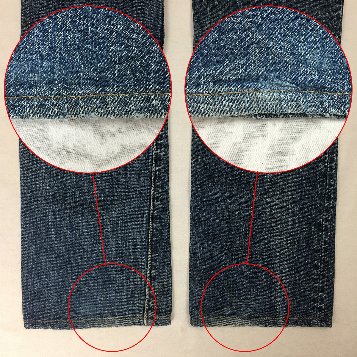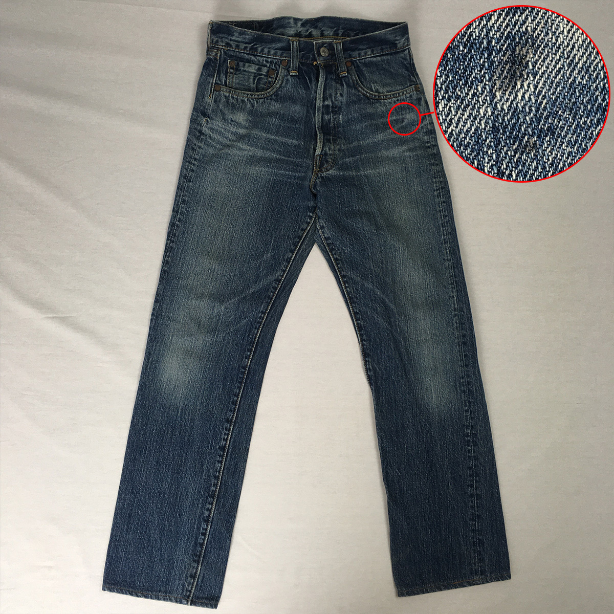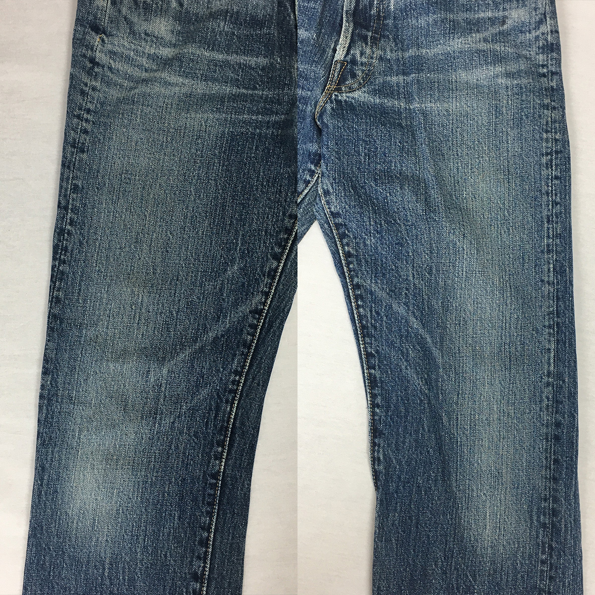 元からユーズド加工が施されており、お尻や両太ももから膝にかけての色落ちくすんだ色合いは加工によるものです。