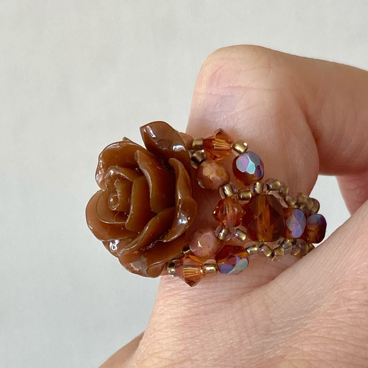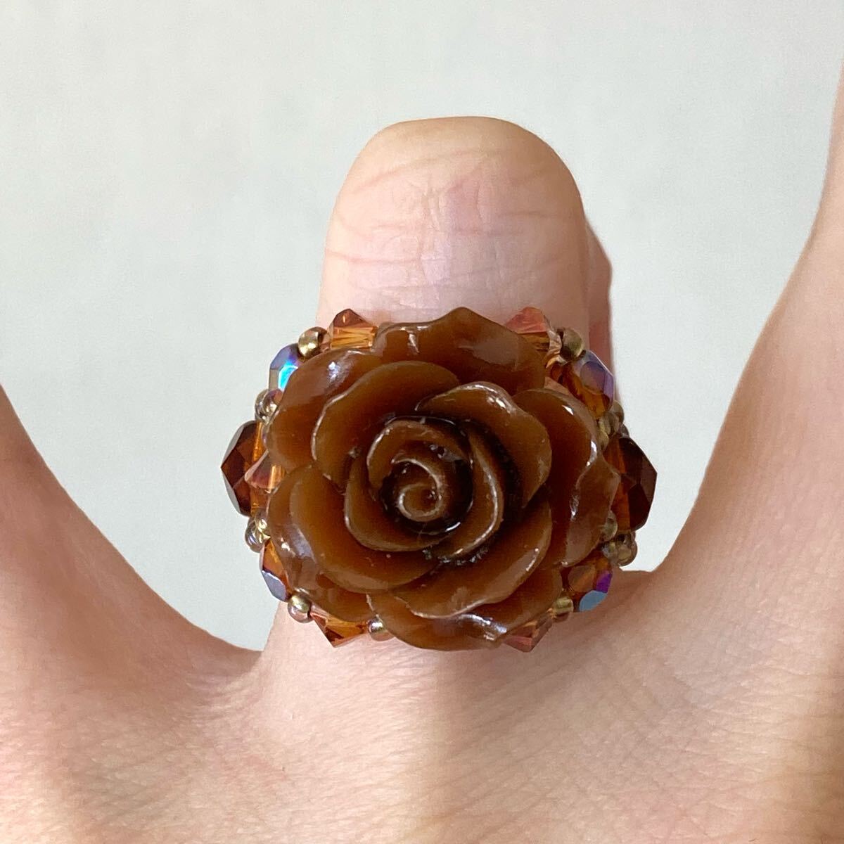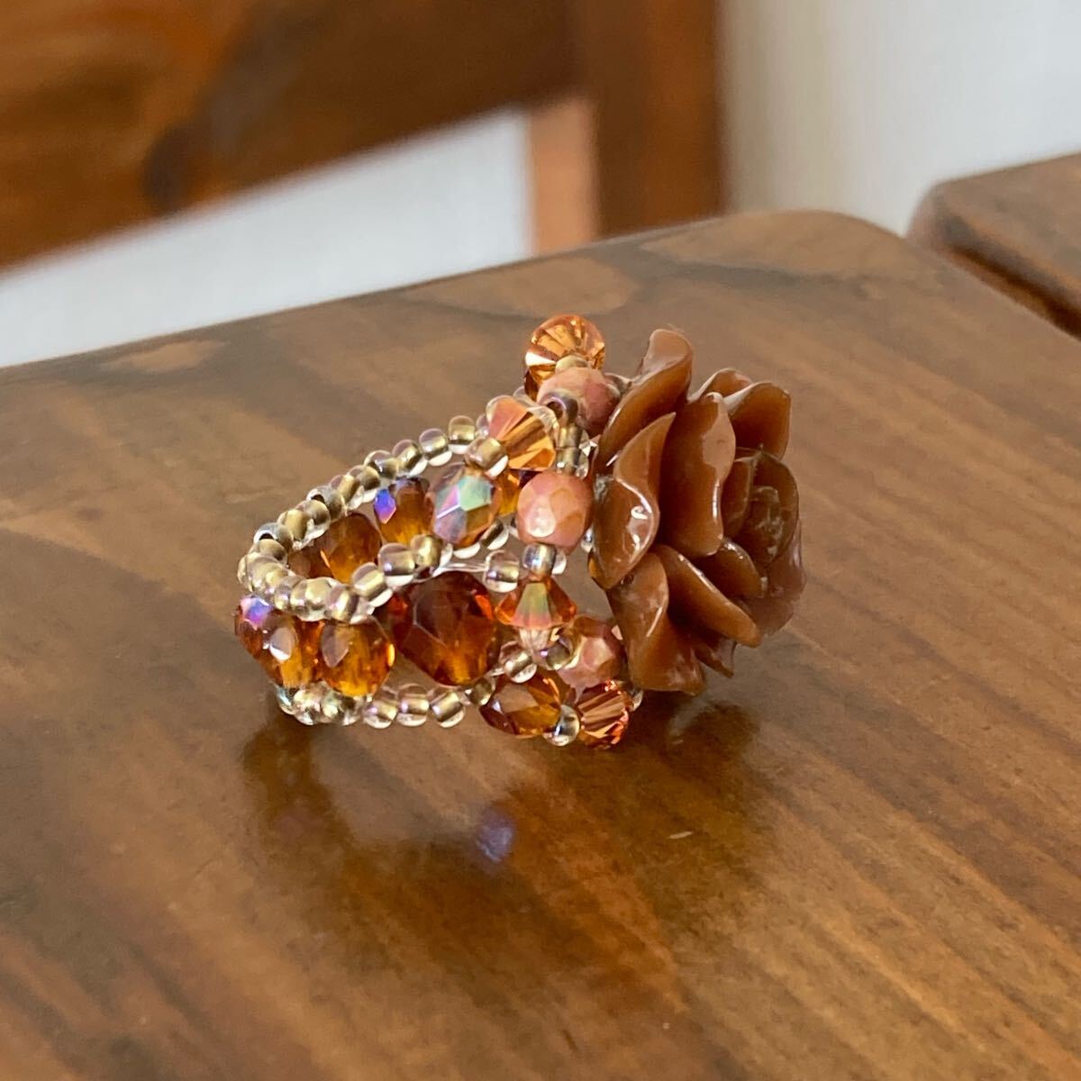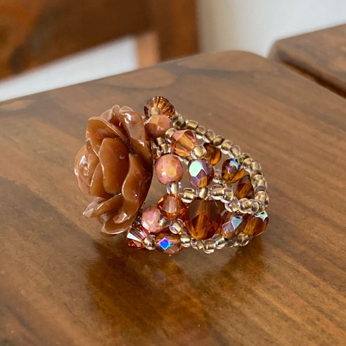 20mmのブラウンの薔薇のビーズ、4mmのブラウン、ピンクブラウンのチェコビーズ、4mmのブラウンのスワロフスキー、6mmのブラウンのチェコビーズ、クリアゴールド系の丸小ビーズで作ったリングです。