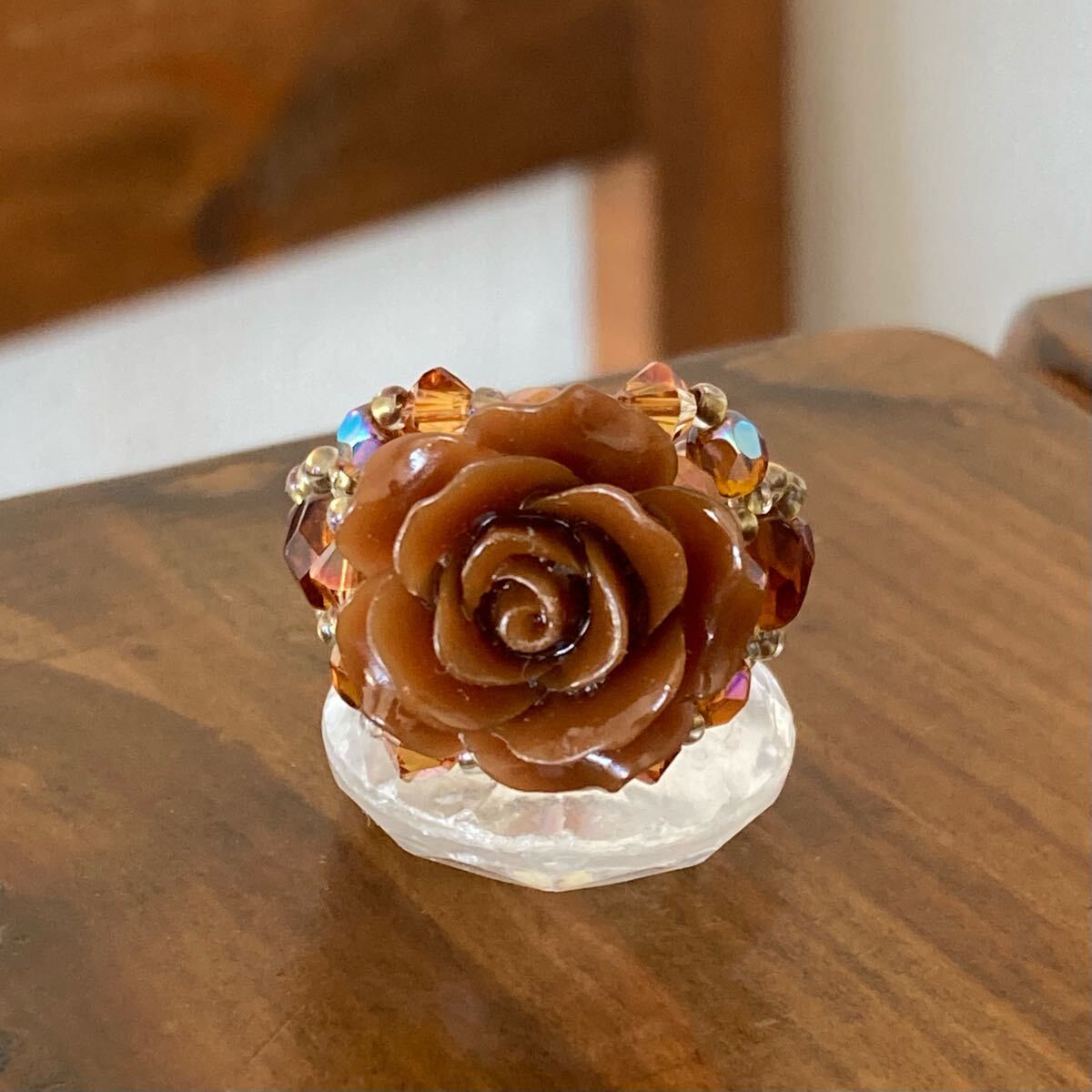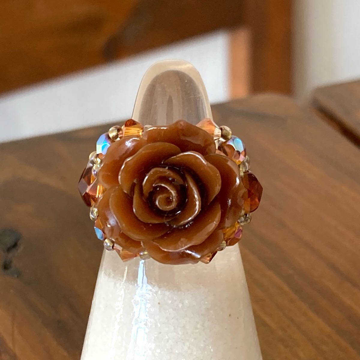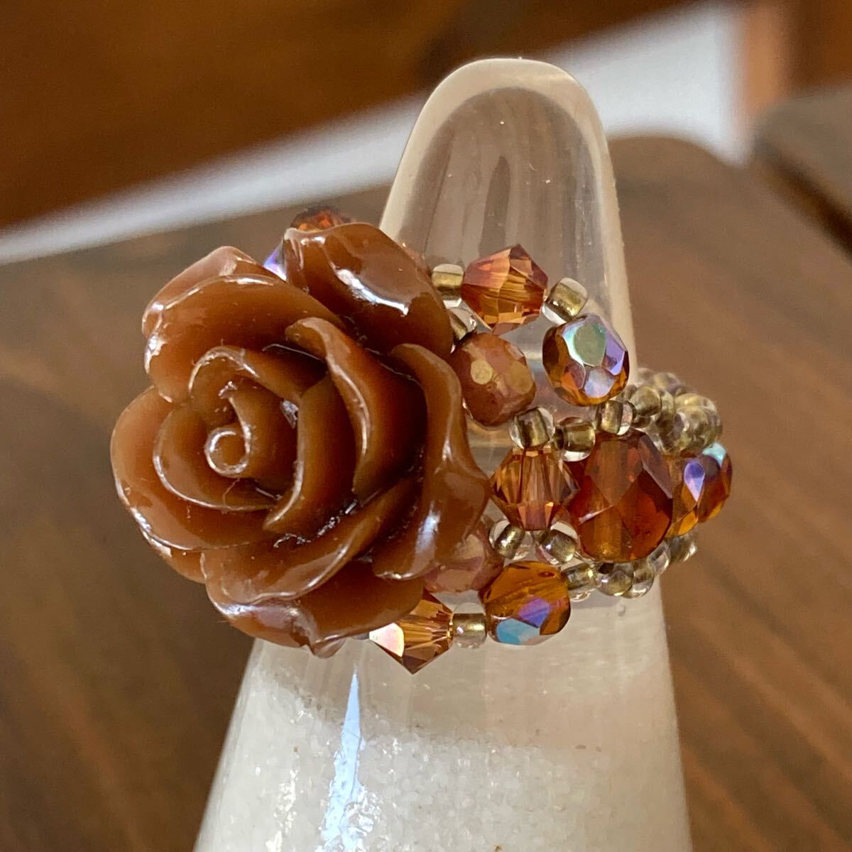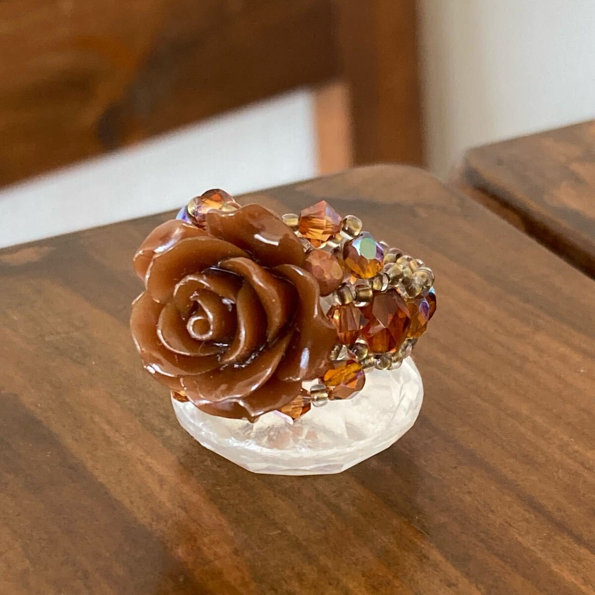 20mmのブラウンの薔薇のビーズ、4mmのブラウン、ピンクブラウンのチェコビーズ、4mmのブラウンのスワロフスキー、6mmのブラウンのチェコビーズ、クリアゴールド系の丸小ビーズで作ったリングです。