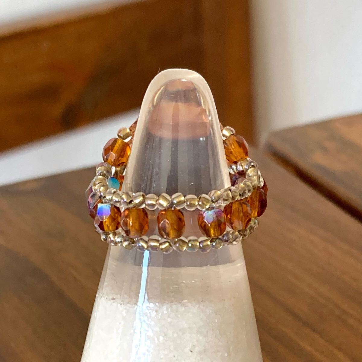 サイズは指周り約5.5cmです。(テグスなので前後します。)