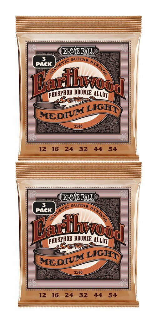 • Now available in convenient three-set packs. Ernie Ball Earthwood Medium Light Phosphor Bronze Acoustic Guitar Strings are made from 92% copper, 7.7% tin, 0.3% phosphorus wire wrapped around tin plated hex shaped steel core wire. These guitar strings have a light orange, gold color and provide a mellow, ringing sound, with excellent clarity. Gauges .012, .016, .024w, .032, .044, .054