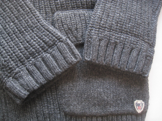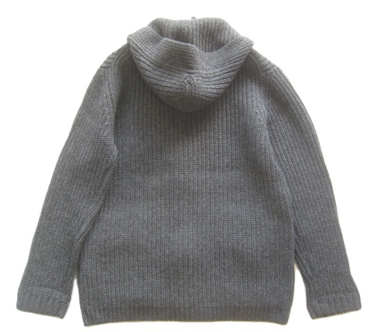 上質なヴァージンウールニット素材を使用しています。ダッフルコートをショート丈にしたようなデザインのニットジャケットでとてもカッコいいです。定価は約50,000円です。