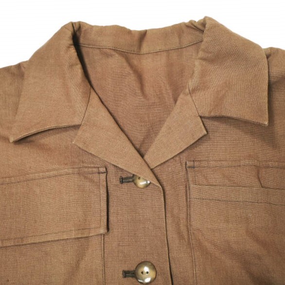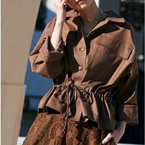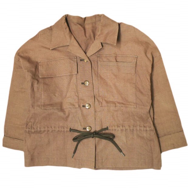 胸元のビッグポケットがアイキャッチなジャケット。リネン混の冷涼感あるマテリアルで、さらりとシャツ感覚で羽織れるデザインが魅力的。ストレッチが効いて着やすいだけでなく、シワになりにくい優秀な特殊加工を施しています。ドロストした時のウエストのギャザー分量にも拘り、程よいルックスが大人っぽさをキープ。
