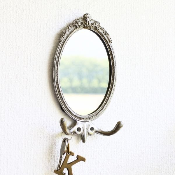 | 壁面を飾る フック付きのアイアンミラーは 頬杖をついた大きな羽のエンジェルが お花に囲まれているデザイン 身だしなみをチェックするのに 重宝する小さめサイズで 毎日身に着けるアクセサリーや 小物を引っ掛けて置く事が出来ます 商品名 : フック付きウォールミラー 商品番号 : scc9271 全体のサイズ(cm) : 幅12×奥行4.5×高さ21 材質 : アイアン ミラー 重量 : 870g 生産国 : 中国 ※壁掛け用金具2か所(取り付け用ネジは付属しません) ※全体にエイジング加工を施したアンティーク調デザインです ※ミラーやフレームの小さな擦り傷等は予めご容赦下さい ※ディスプレイによる色の違いはご了承下さい |