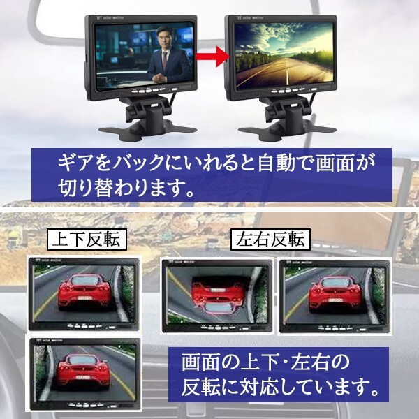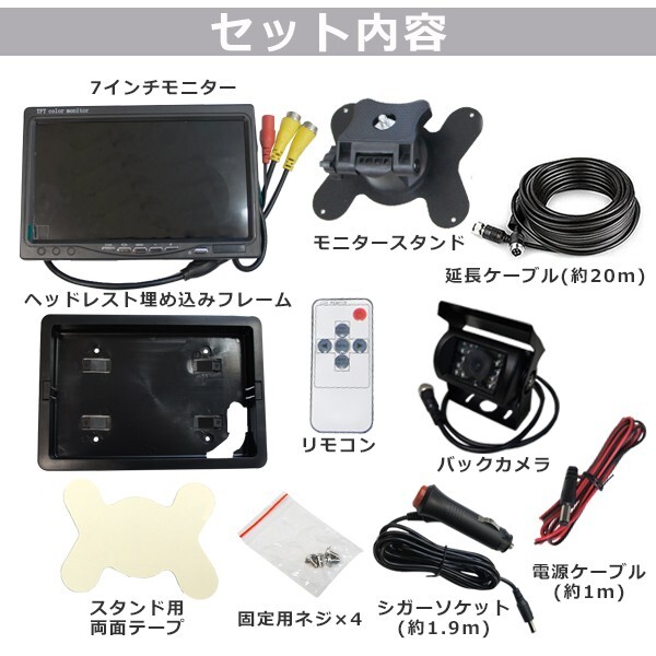 | 商品内容 | ◆セット内容◆ ・7インチTFT液晶モニター ・モニター用オンダッシュ固定スタンド ・ヘッドレスト埋め込みフレーム ・専用リモコン ・簡易説明書(英語) ・バックカメラ ・バックカメラ取付ねじ ・シガーソケット(約1.9m) ・延長ケーブル(約20m) ・電源ケーブル(約1m) ・モニタースタンド用両面テープ |