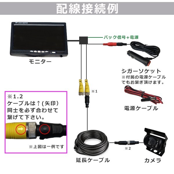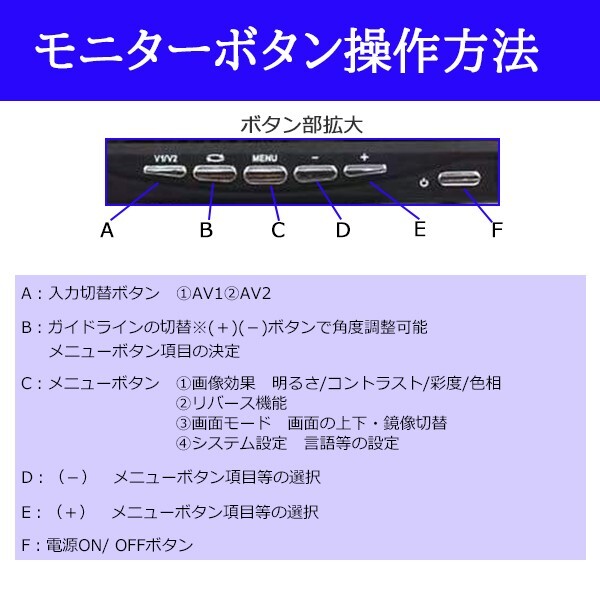 | 商品説明 | 【おすすめポイント】 ・バックカメラ1台と7インチモニターのセットです。 ・モニターと有線で直接繋ぐ為、通信状況に影響を受けにくく電波の弱い場所でも使用することができます。 ・約20mケーブルが付属しており余裕をもって配線可能です。 ◆バックカメラ◆ ・トラックにも対応できる24V対応のバックカメラです。 ・12V車、24V車どちらでもお使いいただけます。 ・広角120℃で幅広く後方を確認でき、車庫入れ等をサポートします。 ・赤外線LEDライト付きなので、暗い場所でも赤外線照射により視界を確保いたします。 ・明るさに応じた自動切替タイプなので、切替の手間が省けます。※暗視モード時のみ白黒映像 ・安心の防水・防塵(IP67)加工済です。※完全防水ではございません。 ・ガイドラインの表示が可能なので、駐車の時に便利です。 ・角度調整可能なので、お好きな角度に調整して取付ができます。 ◆モニター◆ ・高画質なTFT液晶モニターです。 ・バックギアを入れると自動的にバックカメラ映像に切り替わります。 ・鏡像モードと正像モードがモニター設定で切替可能です。 ・オンダッシュ固定スタンド付きです。 ・リモコン付きで簡単に遠隔操作ができます。 【商品詳細】 ◆バックカメラ◆ ・本体サイズ:約7.5×5×7.5(cm) ・ナイトビジョン:自動ゲイン制御、自動ホワイトバランス、自動逆光補正 ・有効画素数:1280×720P ・レンズ広角:120度 ・LED:18個 ・防水/防埃:IP67 ・動作電源:DC12V/2A ・最大電力:3W ◆モニター◆ ・液晶サイズ:7.0インチ ・表示モード :16:9(4:3) ・画面有効画素数:1024*600 ・映像システム:PAL/NTSC ・本体サイズ:約17.3x 11.3 x 2(cm) ・重量:約254g ・電源:DC12V-24V ・消費電力:6W ・スタンド:約9×12(cm) ※こちらの商品は「音声出力」はございません。ご了承ください。 関連キーワード:バックカメラモニターセット カメラ モニタセット 有線 7inch 12V/24V 上下 左右 反転 20m 広角120° 赤外線照射 IP67 角度調整 赤外線LEDライト 車庫入れ 鏡像モード 正像モード 高画質 TFT液晶モニター リモコン付き LED 18個 軽自動車 自動車 普通車 重機 大型 小型 バス キャンピングカー バックモニター 自動切換 駐車 縦列駐車 バック 運転 ドライブ 安全 対策 いすゞ エルフ スズキキャリイ スバルサンバーオープンデッキ サンバートラック ダイハツグランマックストラック デルタトラック ハイゼットデッキバン ハイゼットトラック ハイゼットピック トヨタダイナ ダイナハイブリッド タウンエーストラック トヨエース トヨエースハイブリッド ハイエーストラック ピクシストラック ライトエーストラック ホンダ アクティトラック マツダ スクラムトラック タイタン タイタンダッシュ ボンゴトラック ボンゴブローニイトラック 三菱 デリカトラック ミニキャブトラック ミニキャブミーブトラック 三菱ふそうキャンターEX キャンターエコハイブリッド キャンターガッツ 日産 NT100クリッパー NT450アトラス アトラス クリッパートラック コンドル バネットトラック 日野自動車 デュトロ デュトロハイブリッド ※車種・自動車メーカーはあくまで参考車種になりますので、よく仕様・長さ等ご確認の上ご注文下さいませ。 |