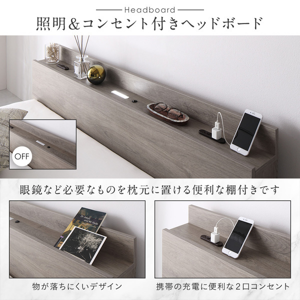 眼鏡など必要なものを枕元に置ける便利な棚付きです