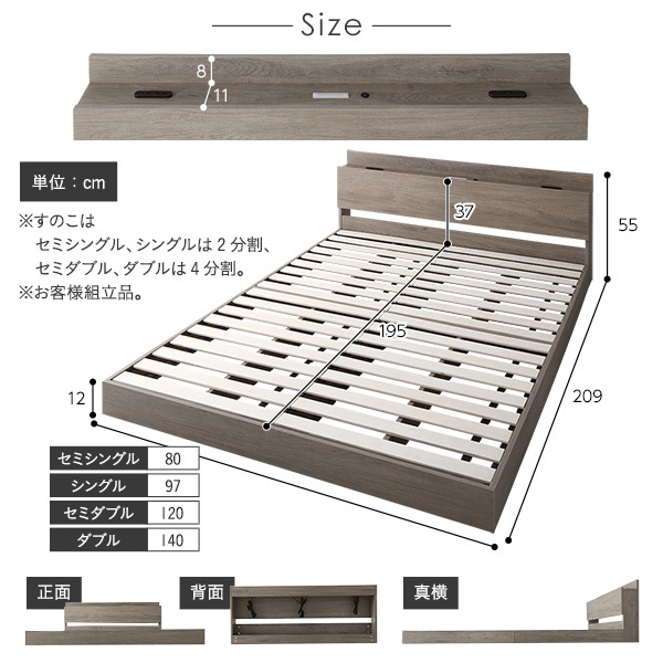 セミダブル:(約)幅120×長さ209×高さ55cm
