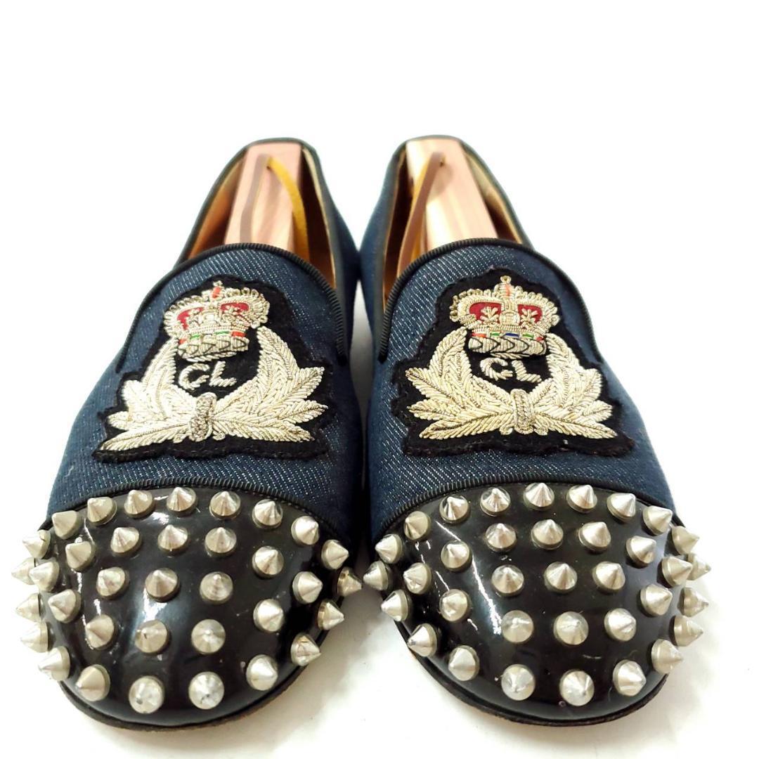 つま先に輝くスパイクスタッズが圧倒的存在感。クラシカルなエンブレム刺繍が高級感を演出します。