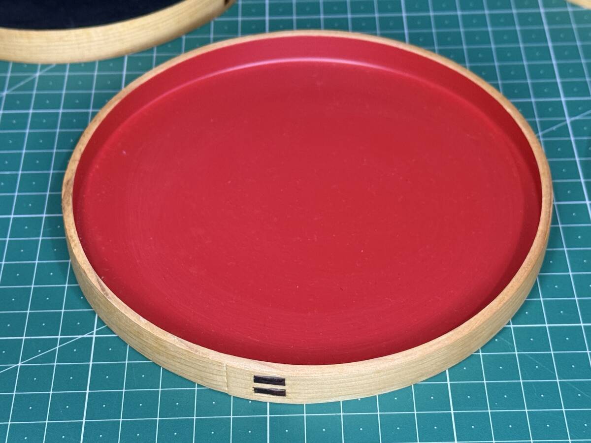 合成漆器。素地部分は秋田杉を使った天然木製で、漆部分は合成漆塗装と思われます。
