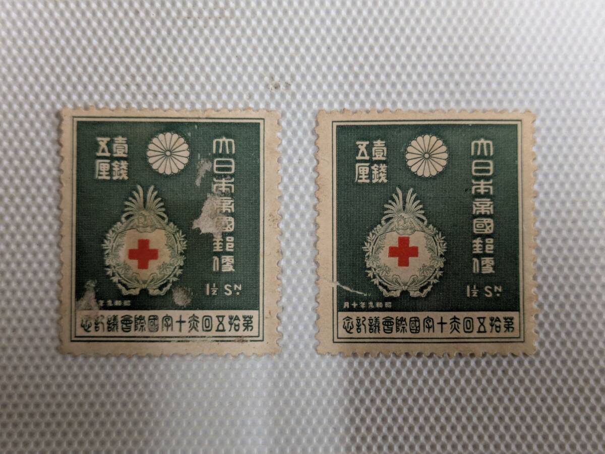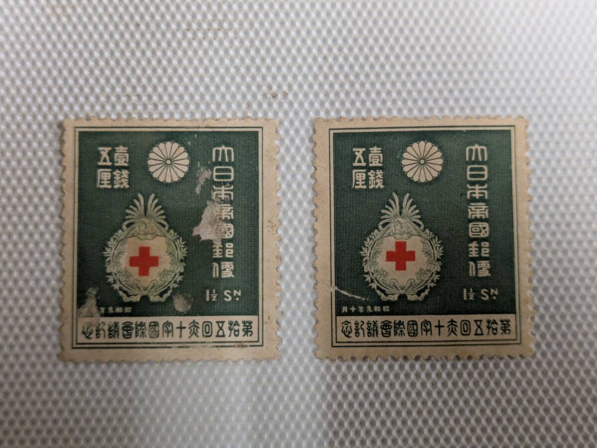 第15回赤十字国際会議記念 1934.10.1 日本赤十字社の桐竹鳳凰記章 1銭5厘切手 単片 2枚 未使用 破れ、はがし跡、ヘゲ
