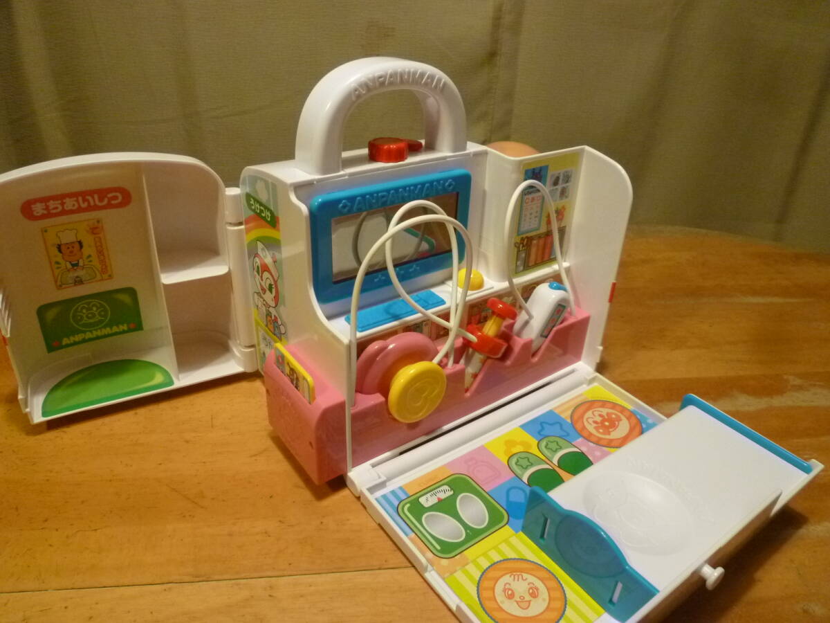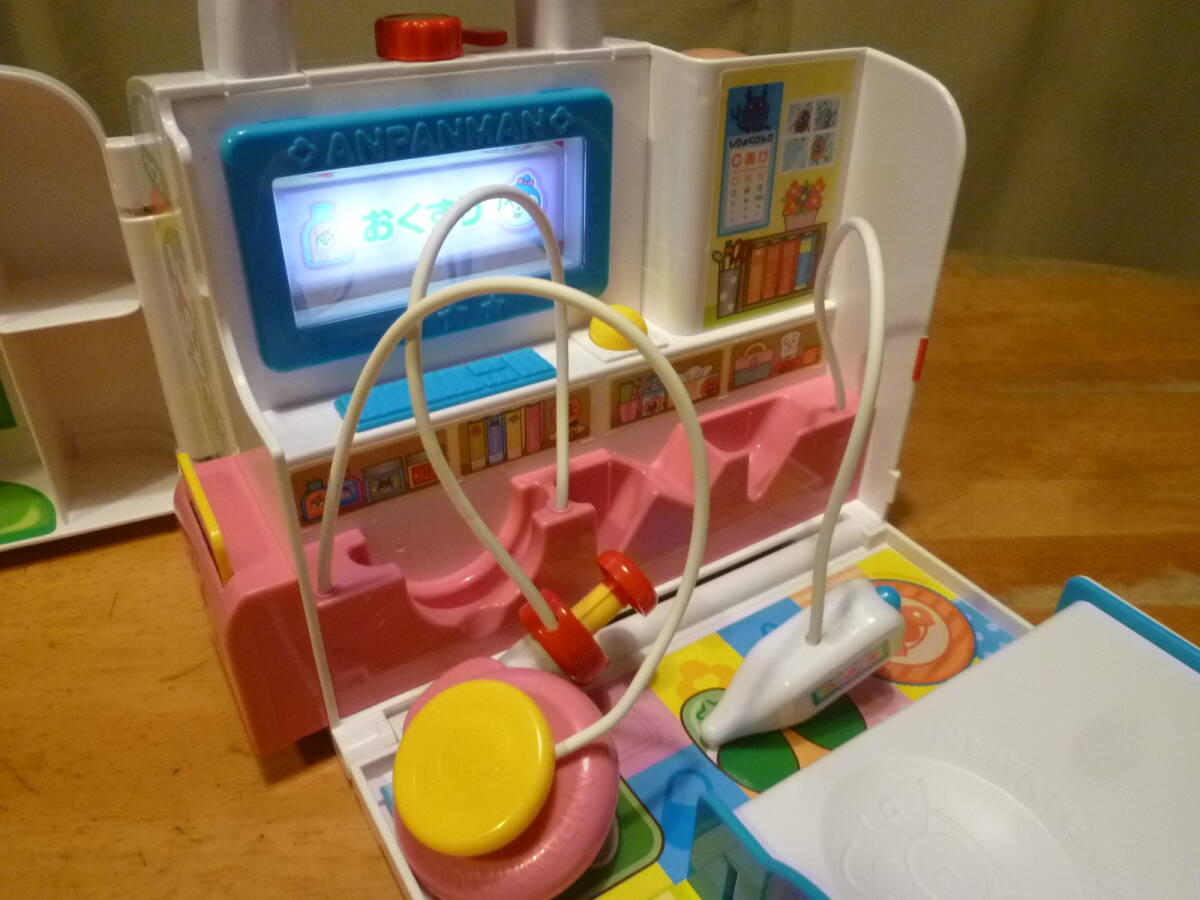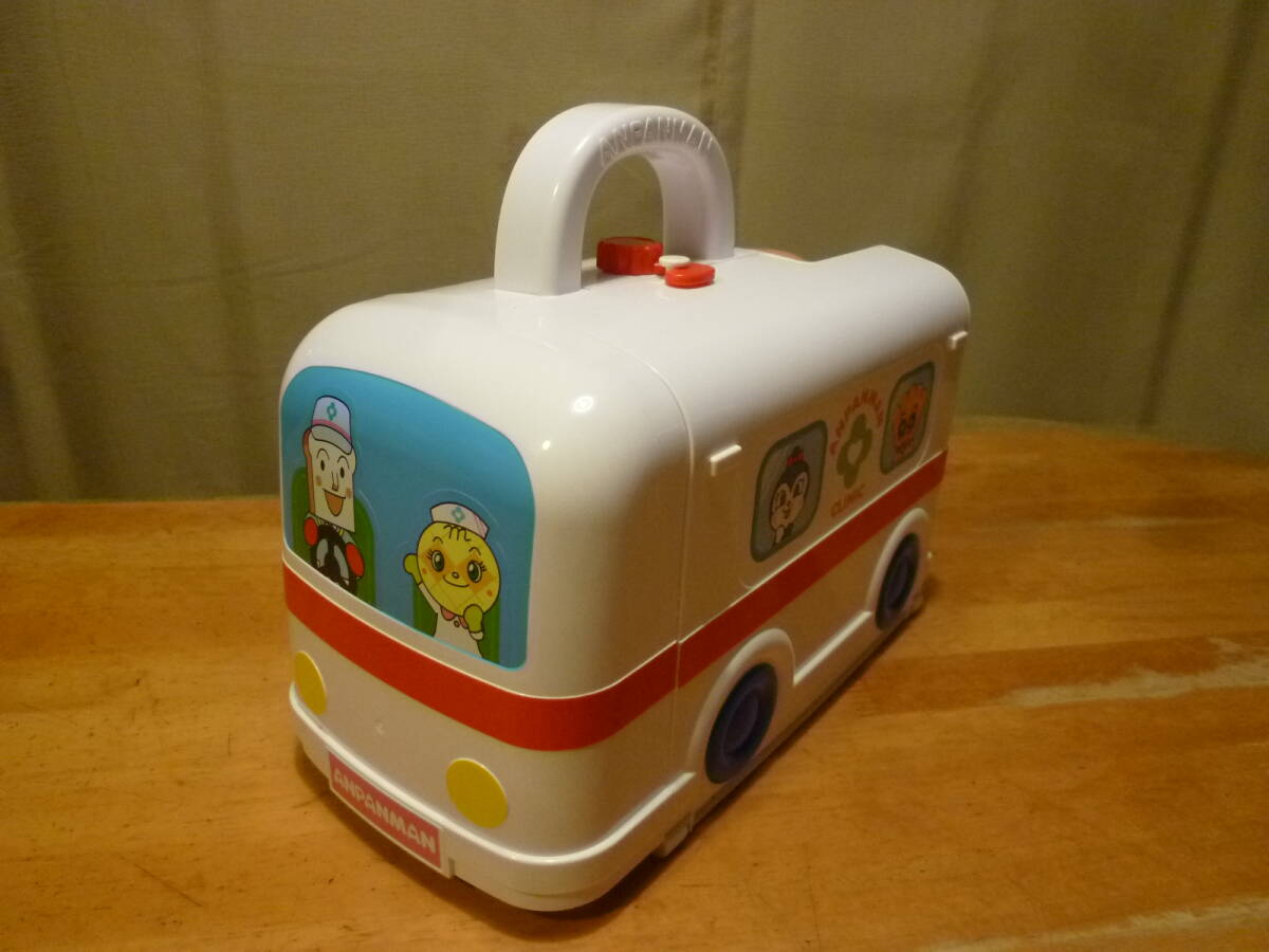 こちらはお子様が大好きなアンパンマンで、スイッチを入れると「ピカッと診断 アンパンマン元気100倍病院」のおしゃべりが、持ち手下のツメを外しサイド全体を開くと診察台や壁際には聴診器・注射器・体温計等が、その上の壁には大きなピカッと診断出来るモニターがあり、黄色いボタンを押すとおくすりやちゅうしゃき・たいおんけい・ちょうしんき等の表示とお友達の顔や色々なおしゃべりとモニターにはカラーの絵表示が出、それに応じて色々な器具を操作するとそれぞれに面白い音が出、アンパンマンが色々元気付けや慰めてくれます。運転席全体も開けドキンちゃんの受付が、しんさつけんを差し込むとドキンちゃんが受け付けでの案内をしてくれたり、待合室への案内や呼び出し等もしてくれる様です。当初の内容等ははっきりしせず、首・肩・腰を動かせるアンパンマンとおくすりビンもセットになっていますが、スイッチ上のチーズ絵内に使用の単4電池3本は別となります。