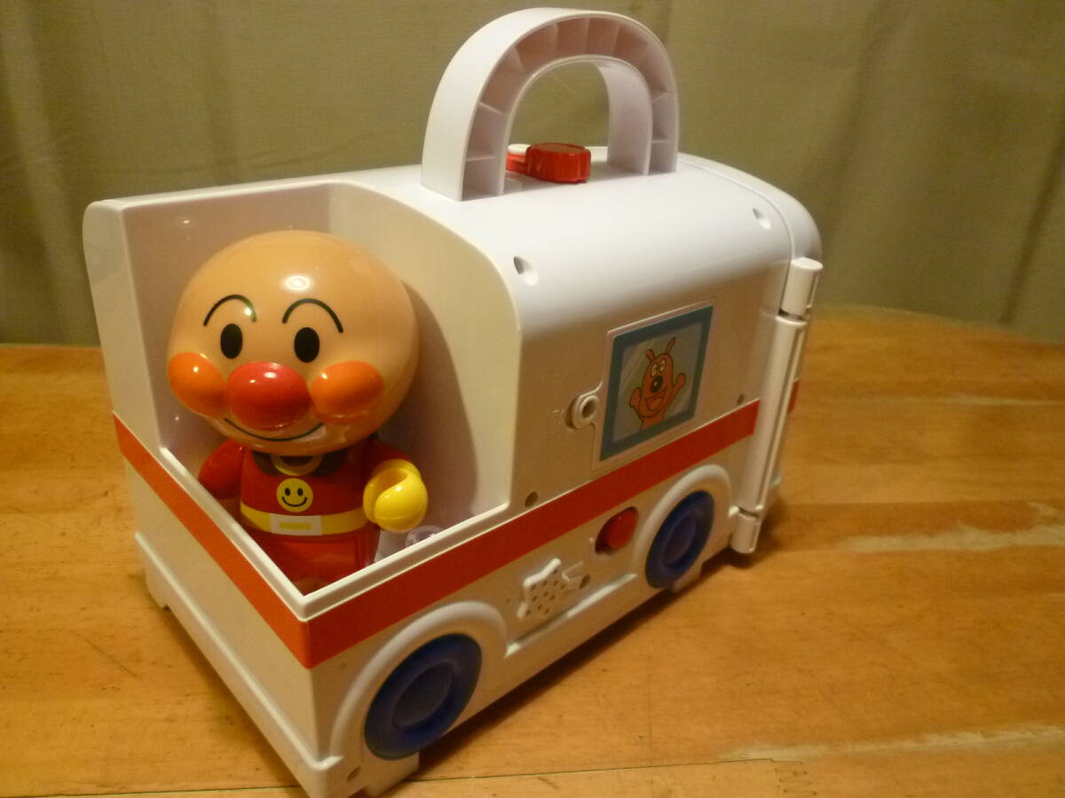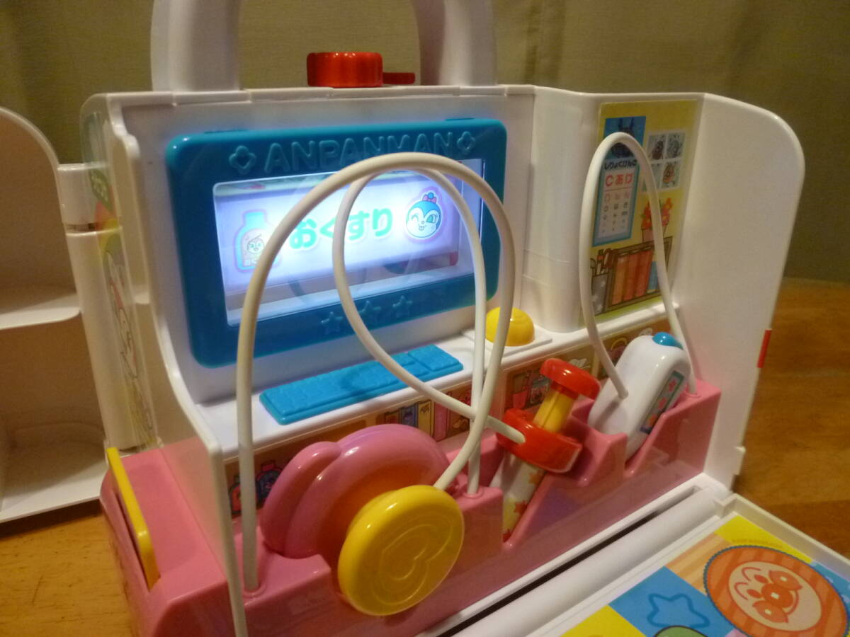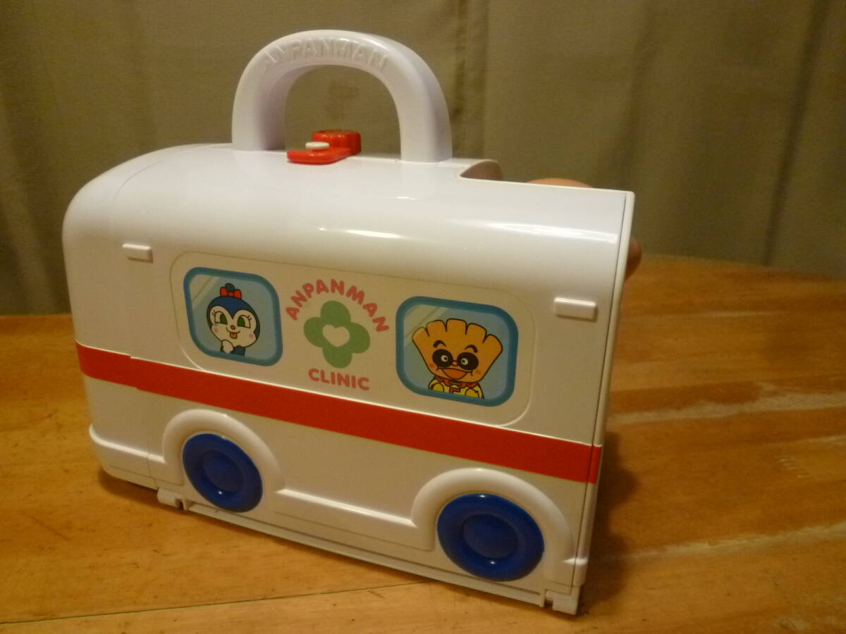 こちらはお子様が大好きなアンパンマンで、スイッチを入れると「ピカッと診断 アンパンマン元気100倍病院」のおしゃべりが、持ち手下のツメを外しサイド全体を開くと診察台や壁際には聴診器・注射器・体温計等が、その上の壁には大きなピカッと診断出来るモニターがあり、黄色いボタンを押すとおくすりやちゅうしゃき・たいおんけい・ちょうしんき等の表示とお友達の顔や色々なおしゃべりとモニターにはカラーの絵表示が出、それに応じて色々な器具を操作するとそれぞれに面白い音が出、アンパンマンが色々元気付けや慰めてくれます。運転席全体も開けドキンちゃんの受付が、しんさつけんを差し込むとドキンちゃんが受け付けでの案内をしてくれたり、待合室への案内や呼び出し等もしてくれる様です。当初の内容等ははっきりしせず、首・肩・腰を動かせるアンパンマンとおくすりビンもセットになっていますが、スイッチ上のチーズ絵内に使用の単4電池3本は別となります。