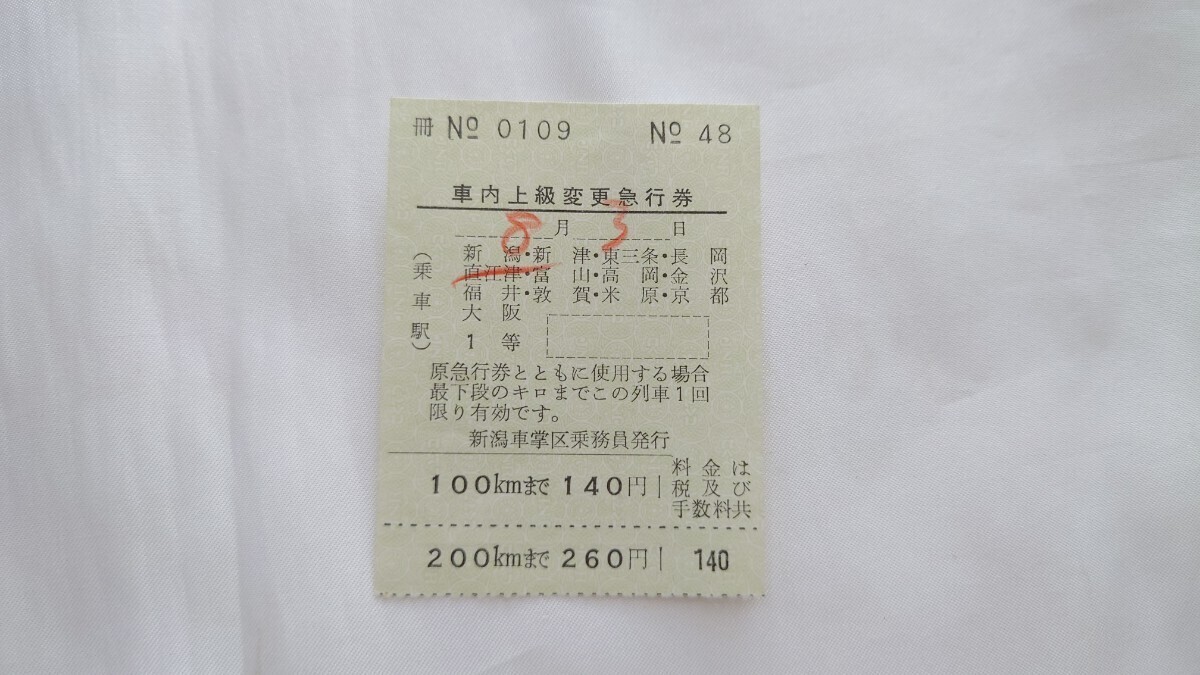 ▲国鉄・新潟車掌区発行▲車内上級変更急行券▲軟券
