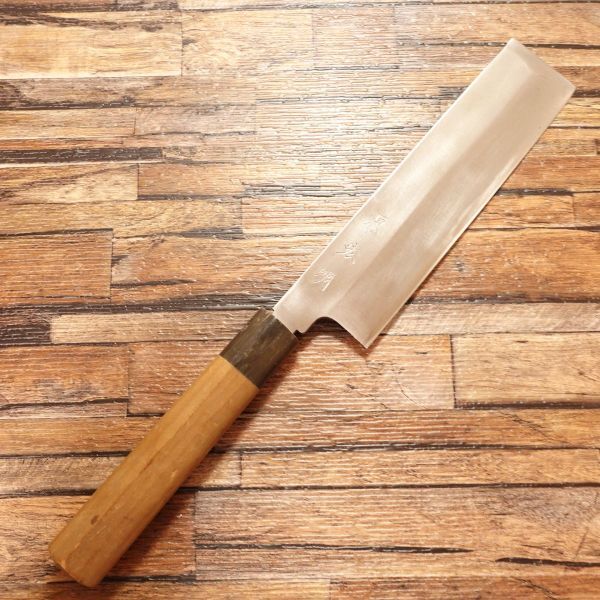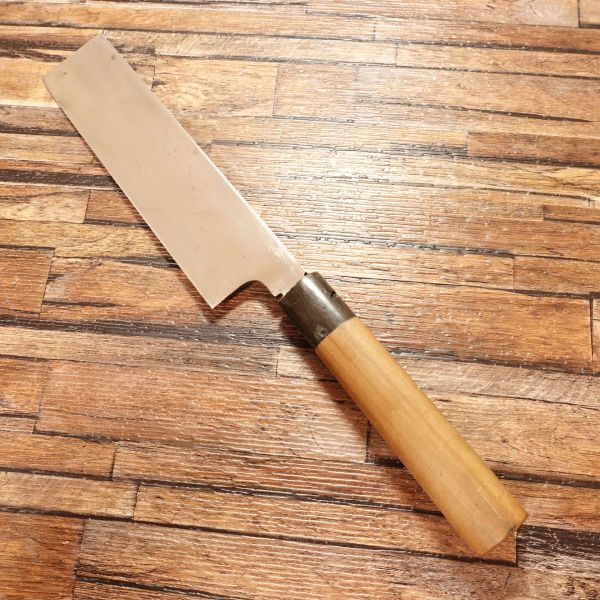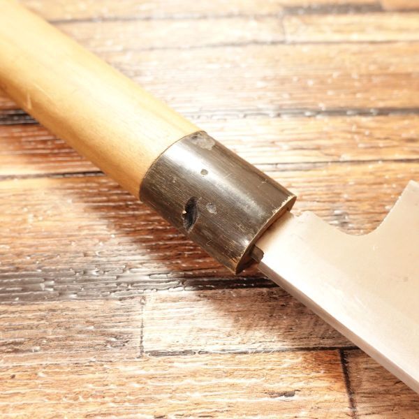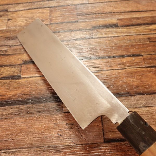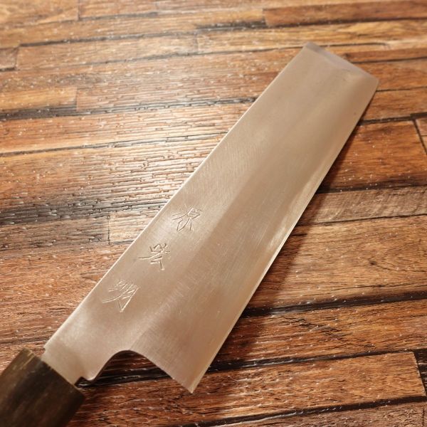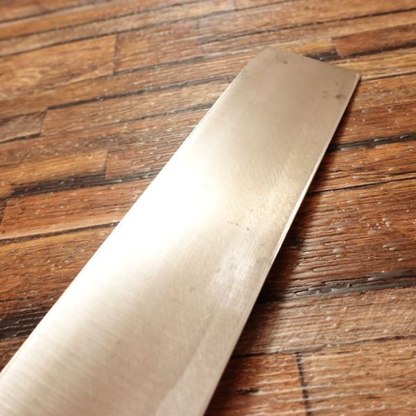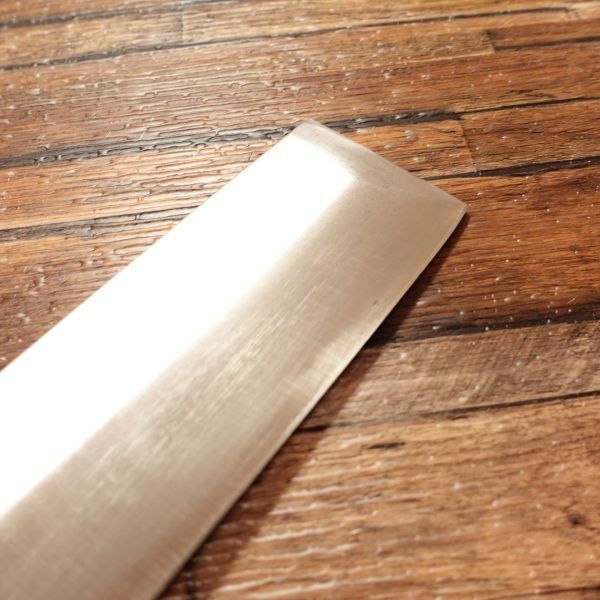 このお品は片刃のハガネ製で、鋭い切れ味が魅力です。あまり使用感を感じないきれいな薄刃包丁です。保管期間があるのか水牛柄には多少のダメージがありますが使用には全く問題ないでしょう。非常に良い薄刃です。