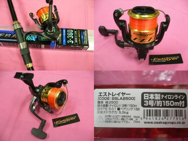 ★Pm ( プロマリン )CB 万能振出 遠投磯竿+糸付リールを出品します。 ①ロッド Pm (プロマリン) BLUEBAY (ブルーベイ)磯 遠投 3-360 (希望小売価格 8400円) 仕様:全長 3.60m 継数 4本 先径 1.6mm 元径 22.7mm 自重 197g 仕舞寸法 102cm 鉛負荷: 5~10号 適合ハリス:ナイロン 3~7号 カラー:ブラック 使用材料:カーボン 55% グラス 45% 中国製遠投用ハードガイド&パイプリールシート使用 遊動ガイド:#1×3個・#2×1個 付属品:シースルートップカバー・ロッド取扱説明書 中国製カーボンロッド * 対象魚:グレ・マダイ・タチウオ・アジ・チヌ・グレ・イサキ・青物 etc... ◇防波堤からのタチウオ釣り・遠投サビキ釣・カゴ釣 etc... 多彩なターゲットに対応するオールラウンド振出遠投ガイドモデル。 ◇磯・波止・管理釣り場等での上物・底物又はサビキ釣・ウキ釣・チョイ投げ等に最適です。 ②リール OGK (大阪漁具) Estlayer (エストレイヤー) ESLA 2500 (定価 オープン) 仕様: 2500番 ギヤ比 5.0:1 ライン 日本製ナイロン 3号(オレンジorイエロー)約 150m付 自重 約 285g 1BB 最大ドラグ力 5.5Kg ゴールドメッキアルミスプール・T型ノブ 左右対応ワンタッチハンドル・遠投竿に十分な糸巻量 注) ワンウェイクラッチ非搭載モデル(ギヤストッパー) MADE IN CHINA ・状態は新品未使用品です。 ・以上の説明をご理解頂ける方また画像で判断頂ける方のみ、ノークレーム・ノーリターンで 入札の程、宜しくお願い致します。 ・神経質な方の入札はご遠慮ください。 |