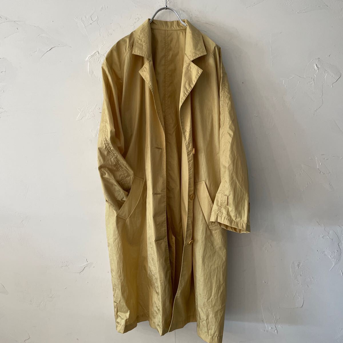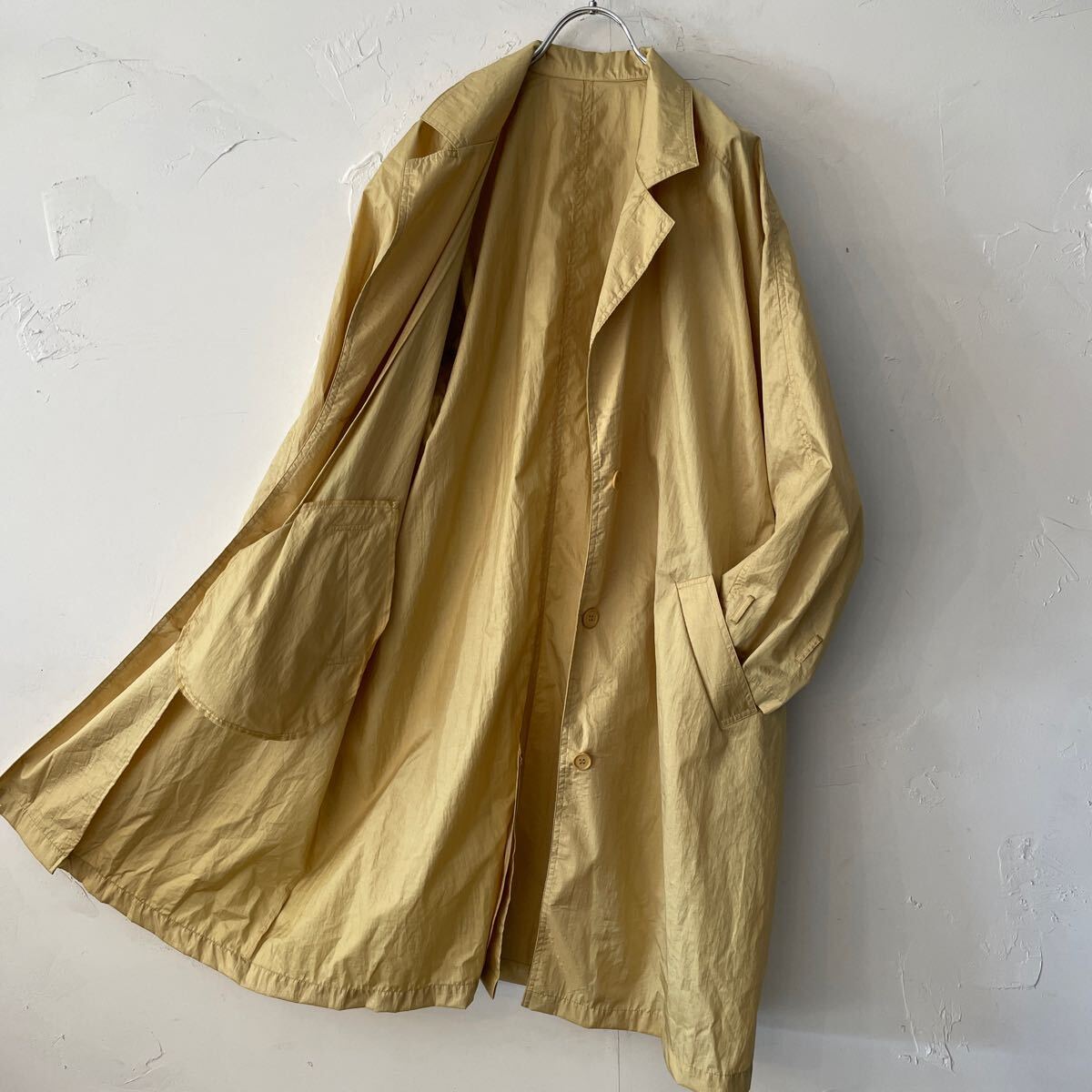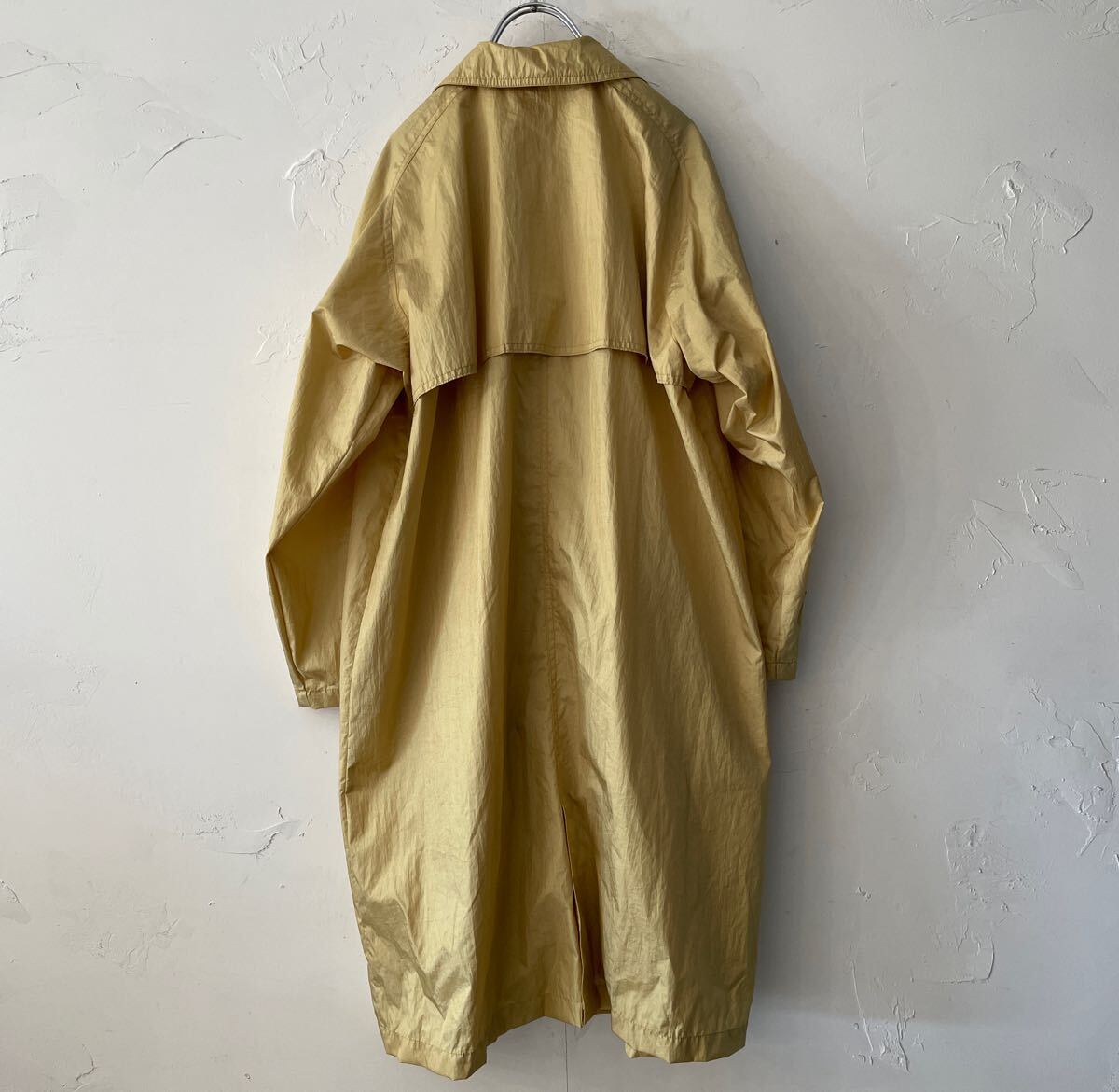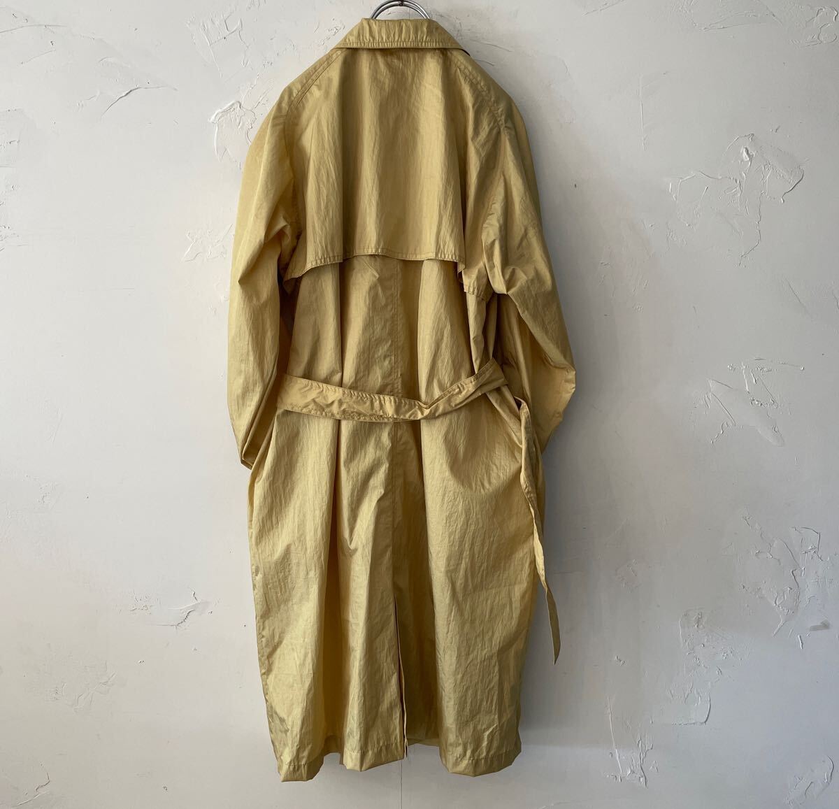 ナイロン100% 光沢感 シワ感のある スプリングロングコート ステンカラーコートになります。薄手の春秋使用です。マスタードイエロー? ベルト付き。フリーサイズ。ラグランスリーブで肩のおちるサイズ感フォルムの良い品です。オーバーサイズで男女問わずざっくりと着て頂けるかと思います日本製 国産古着になります。