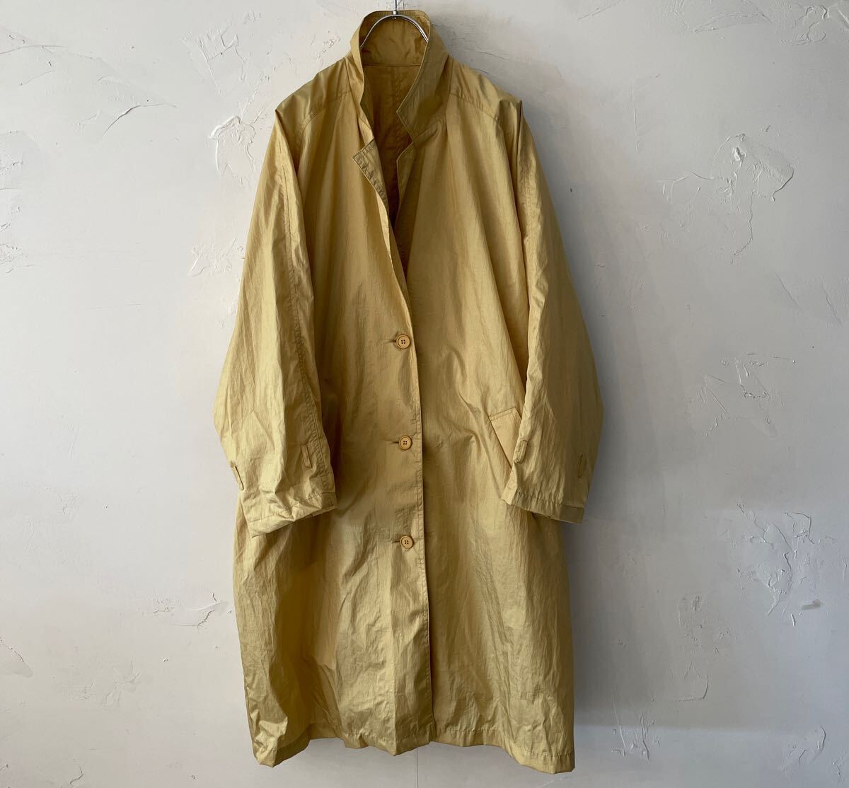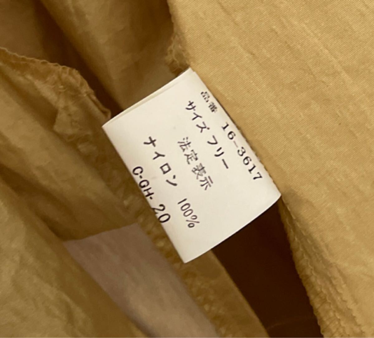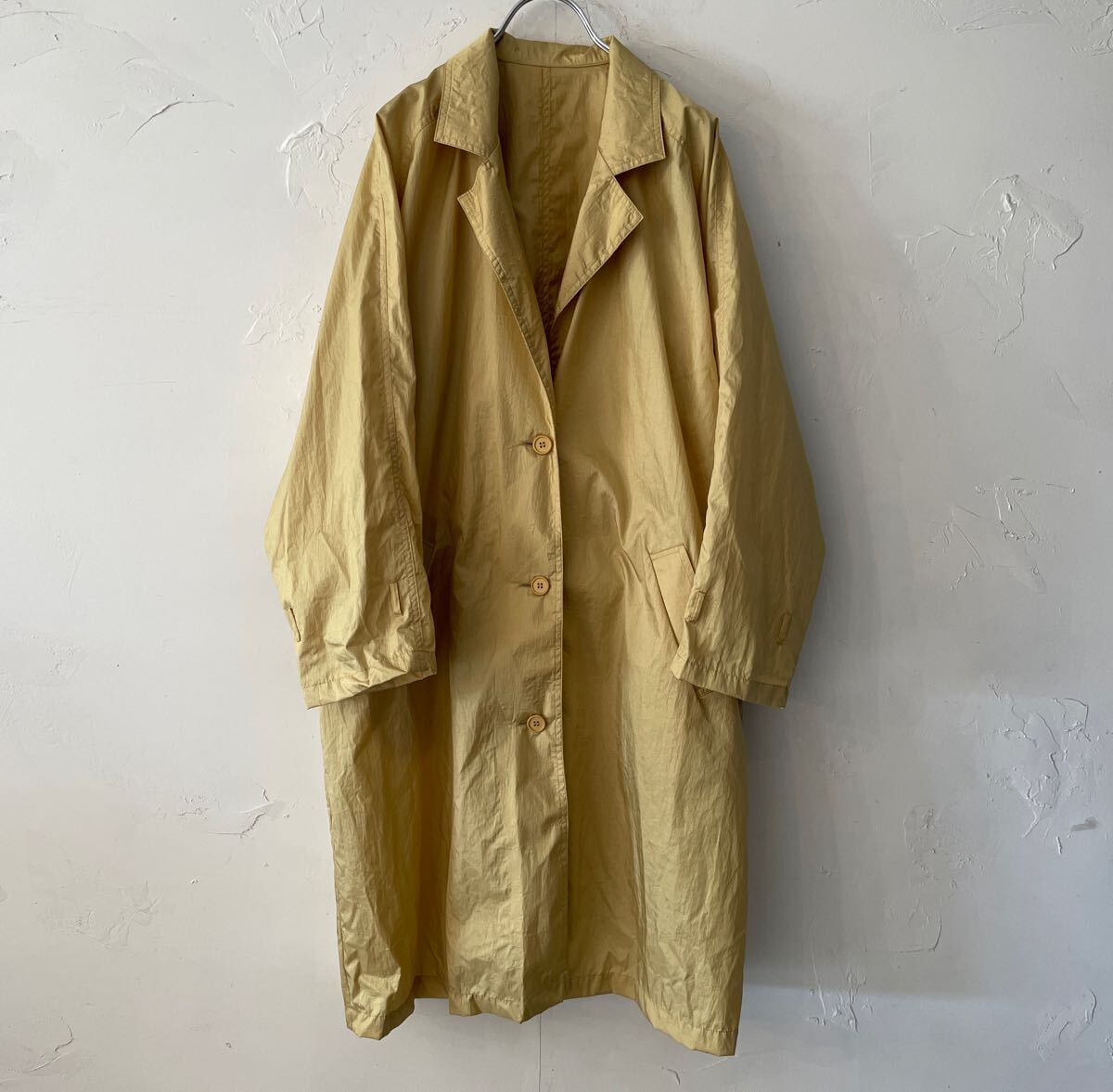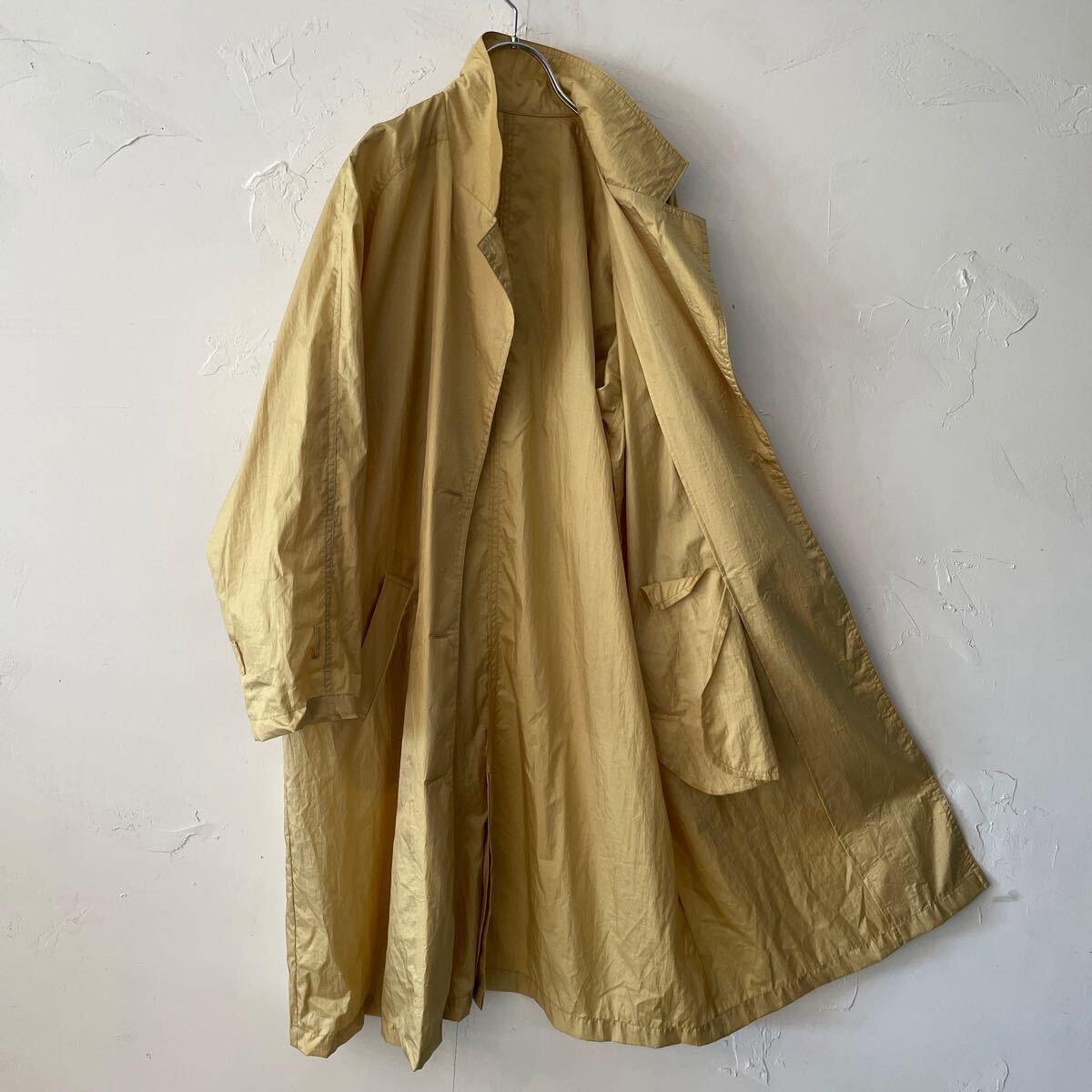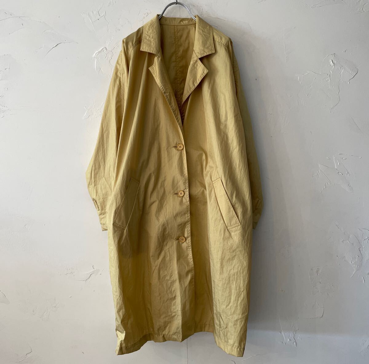 ナイロン100% 光沢感 シワ感のある スプリングロングコート ステンカラーコートになります。薄手の春秋使用です。マスタードイエロー? ベルト付き。フリーサイズ。ラグランスリーブで肩のおちるサイズ感フォルムの良い品です。オーバーサイズで男女問わずざっくりと着て頂けるかと思います日本製 国産古着になります。
