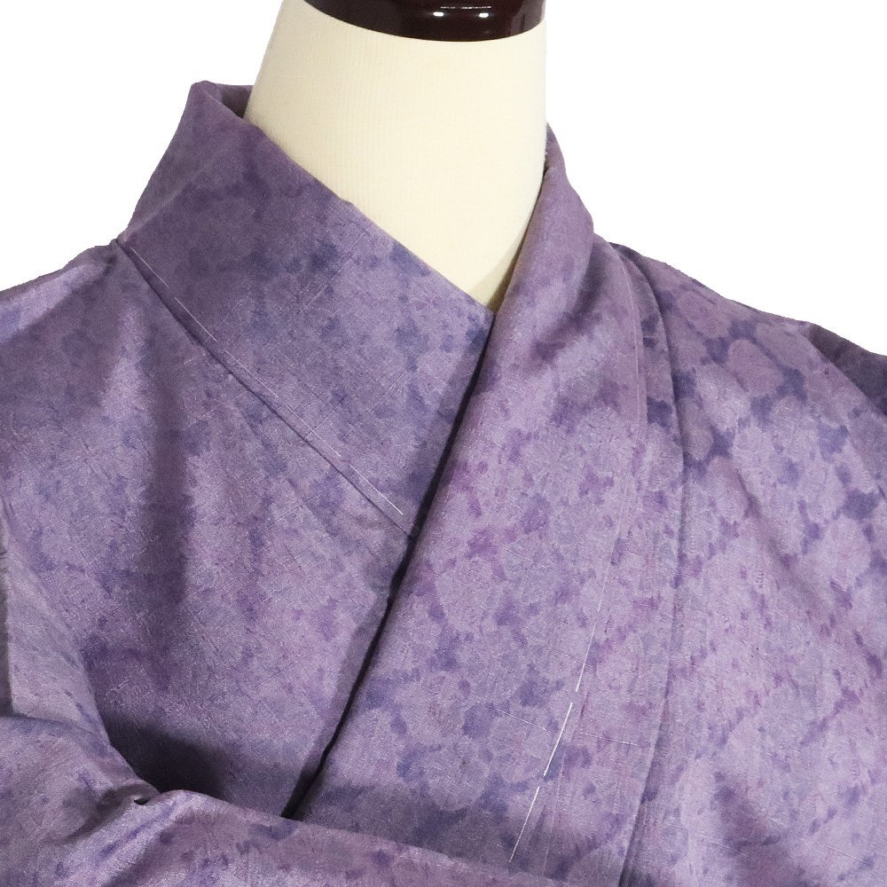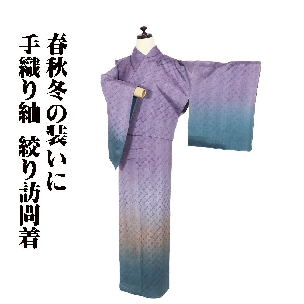 | 手織り紬 訪問着 袷 丹後縮緬地 紫(紅紫色)・緑(緑青色)・橙色(くちなし色)暈し地 蜘蛛絞り 168 広襟 新品 仕付け付き |