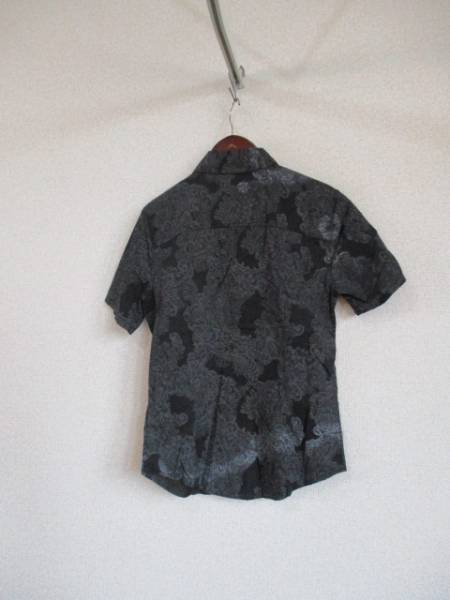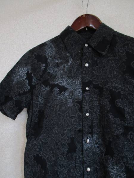 | 商品紹介 | 墨黒の地色にレースのようなプリントが入った半袖シャツです。 スッキリとした形で、後ろ側のみタックでウエストが少しシェイプされた形です。 プリント部分はグレーで、場所によって白っぽかったり、逆に濃いグレーの部分があります。 (少しカーキっぽくも見えます。) 《素材》 綿100% |