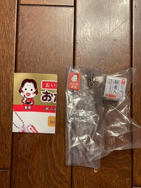 ケンエレファントから発売の「おかめ納豆ボールチェーンマスコット」第2弾全4種のうち『おかめ豆腐 絹美人』です。包装パッケージからたれ等とてもリアルでかわいらしく出来上がっています。内袋未開封、リスト付きです。