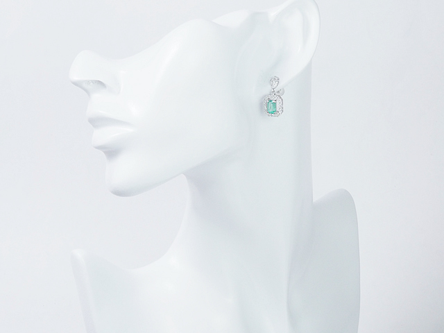 エメラルドのグリーンとダイヤモンドのコントラストが美しい上品なピアスです。揺れるデザインで耳元でキラキラと輝きます。