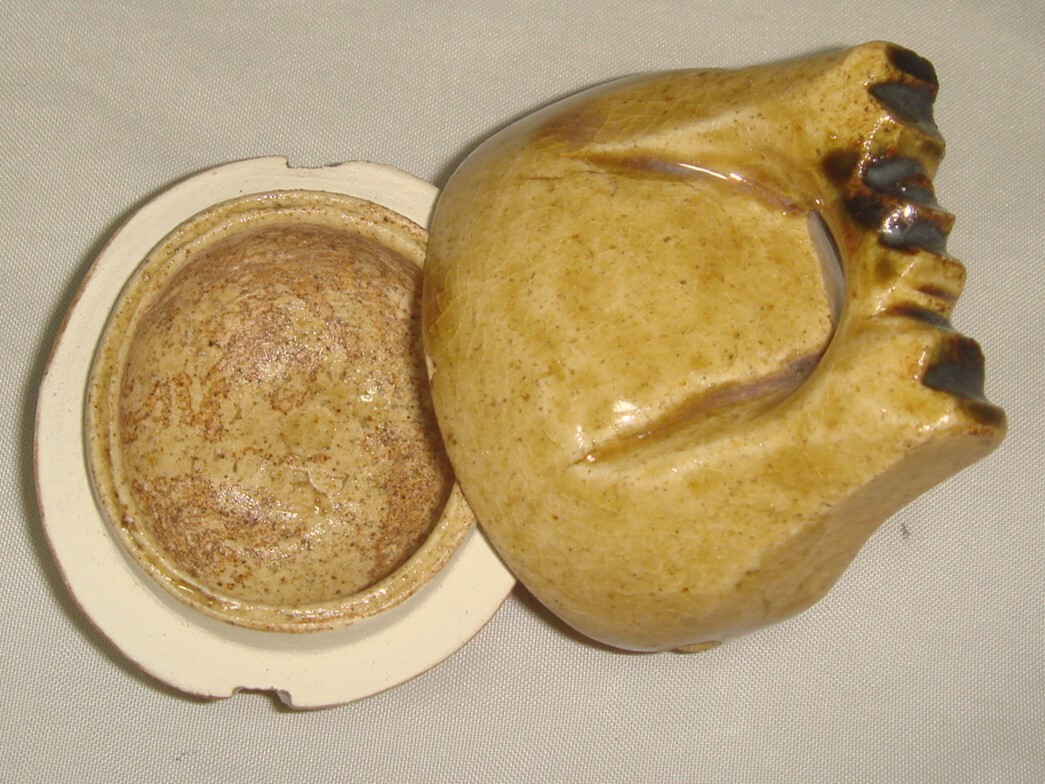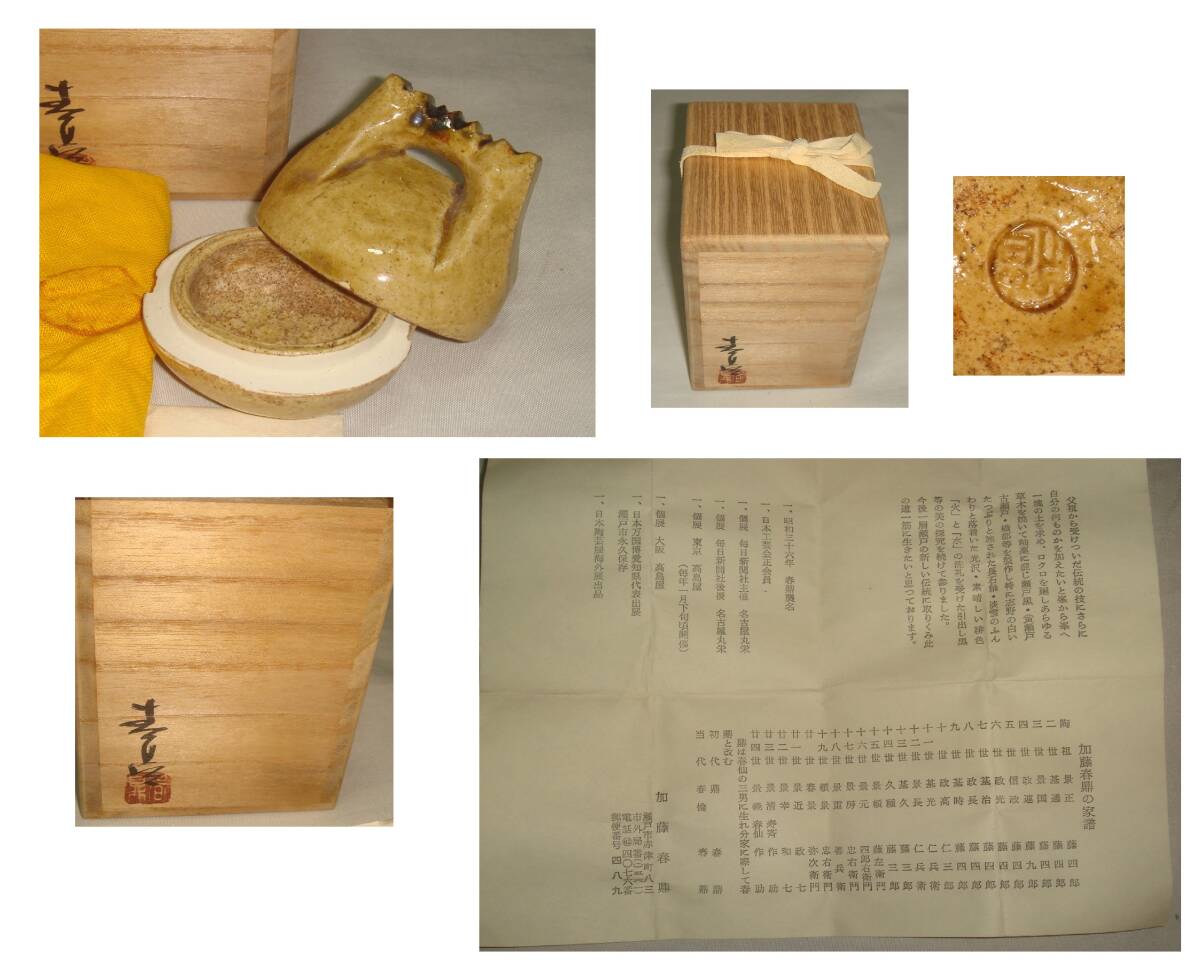 2代目加藤春鼎(春倫)作 黄瀬戸木魚香合 の出品です。殆ど使用されること無く永年大切に所蔵されてました2代目加藤春鼎の逸品、極微細な擦れ等の他特に目立つダメージ無く写真の通り良い状態です。