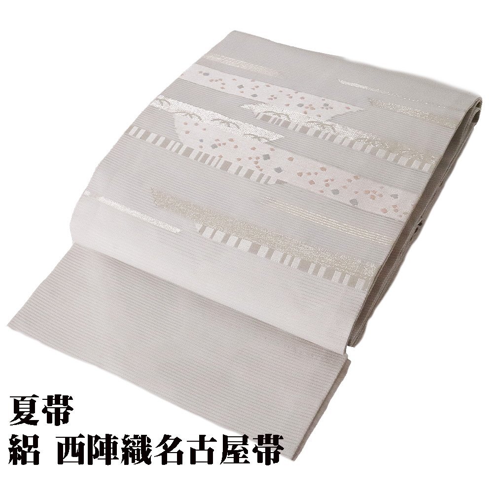 | 絽 西陣織名古屋帯 薄グレー地 あられ模様・横縞 未使用品 仕立て上がり | |