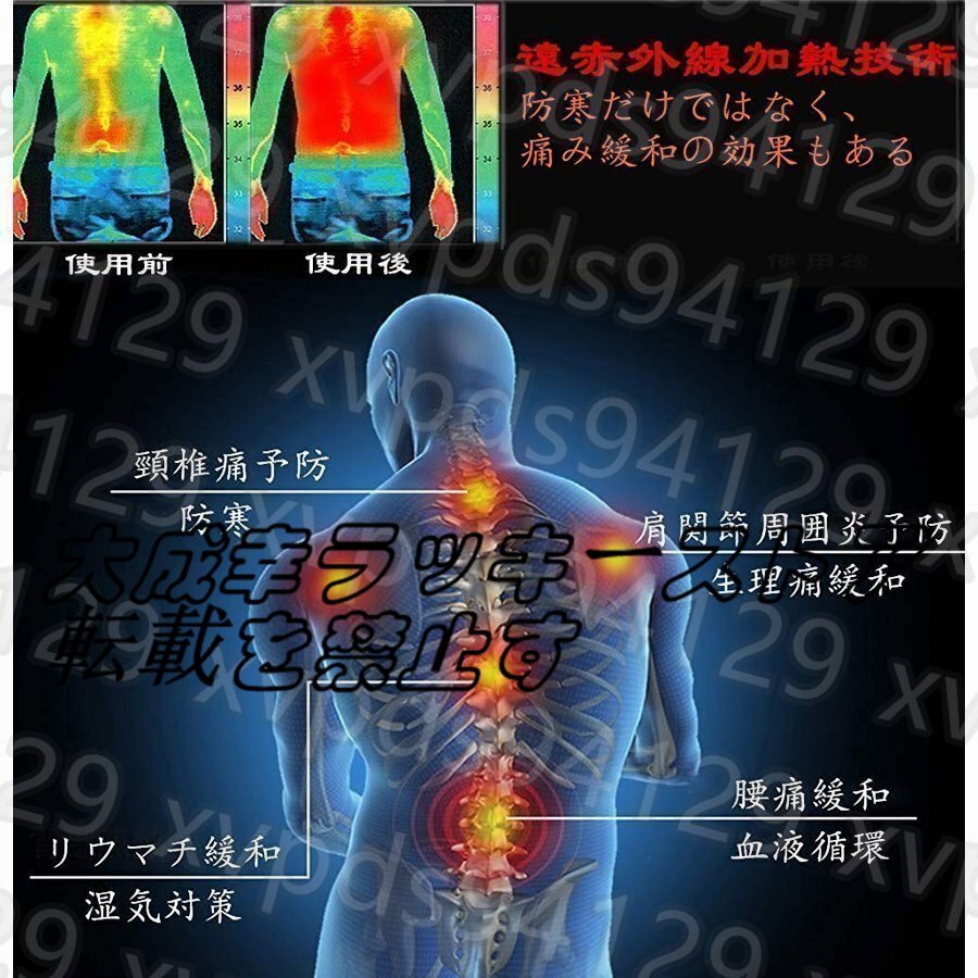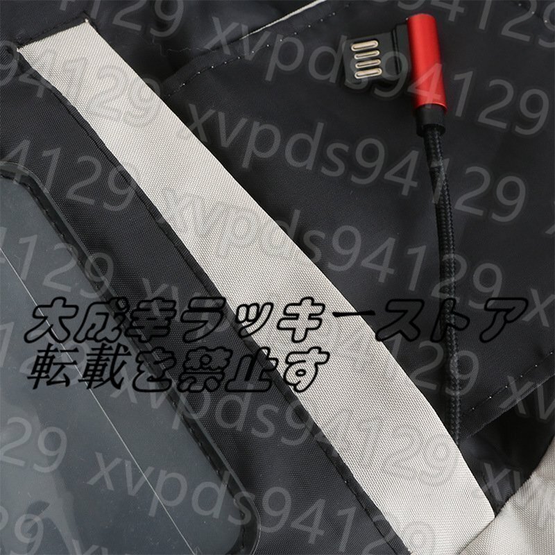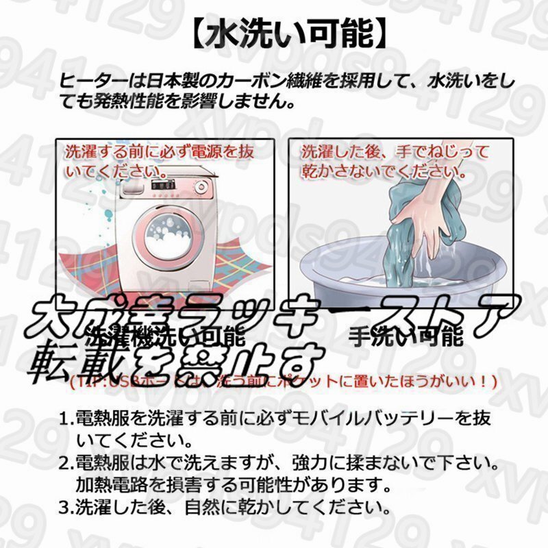 ポイント:防水(外出用最適)7つヒーター内蔵(肘、腹、背中部位)、フード隠し収納可、3段階温度調節、水洗い可、USB接続充電式、
