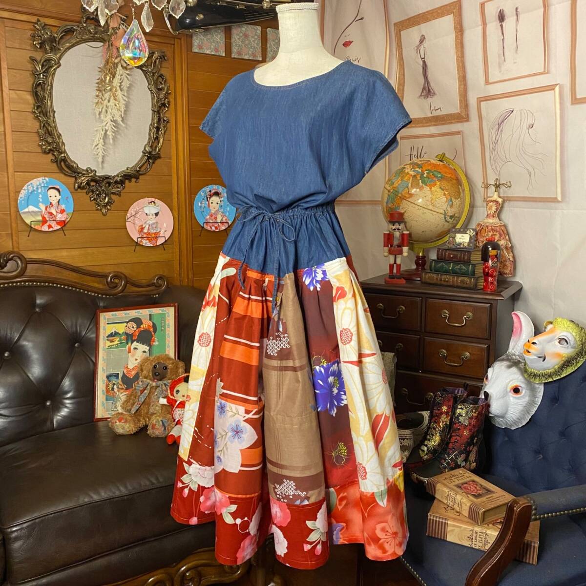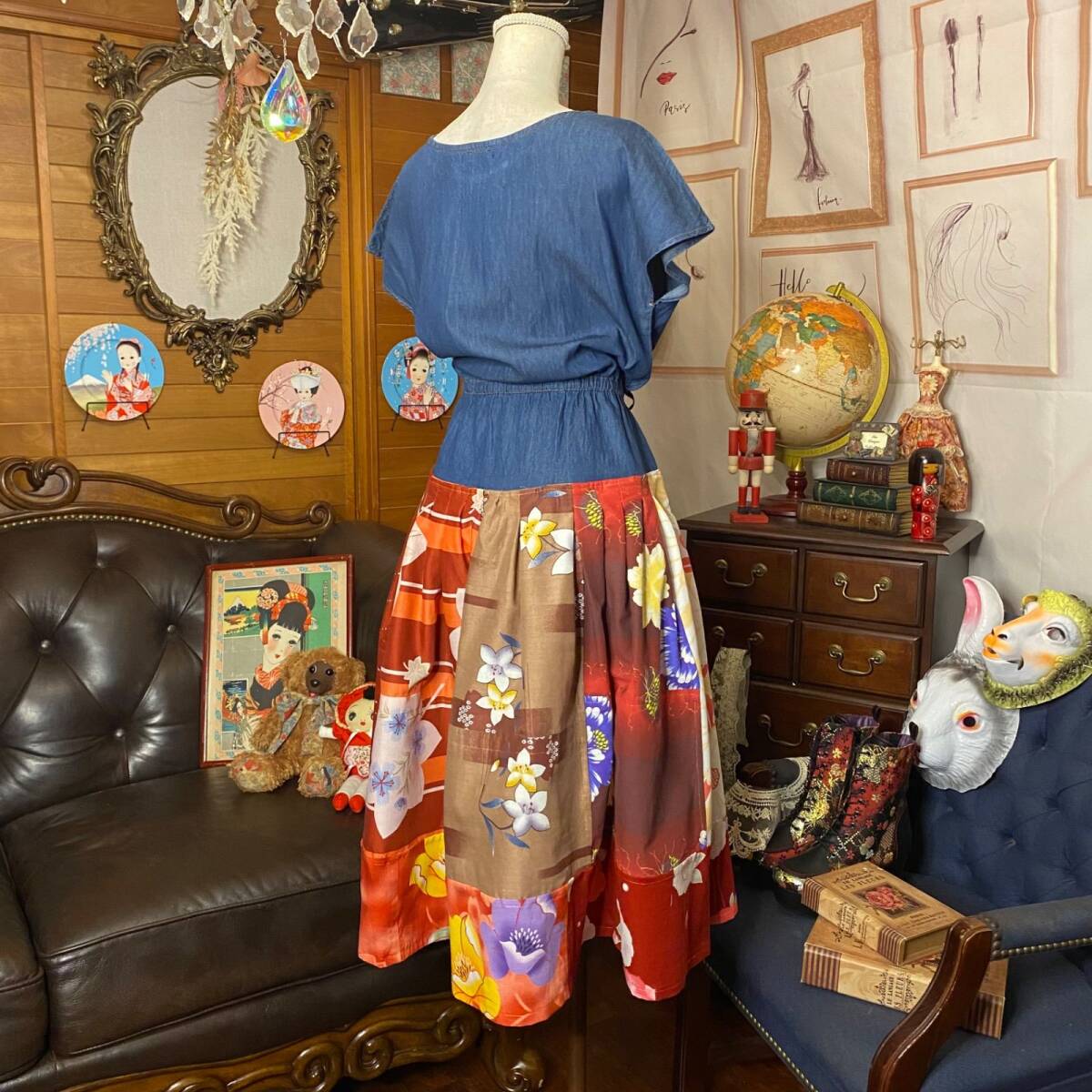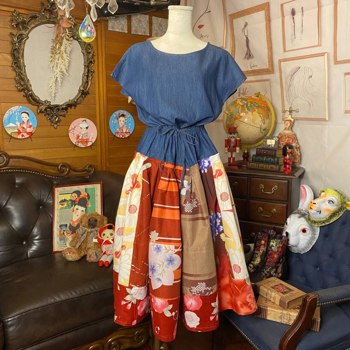 【 和洋折衷 レトロ古着 浴衣 ハンドメイド コラージュ リメイク 和 切り替え ワンピース デニム×赤/レッド系 O-13 】