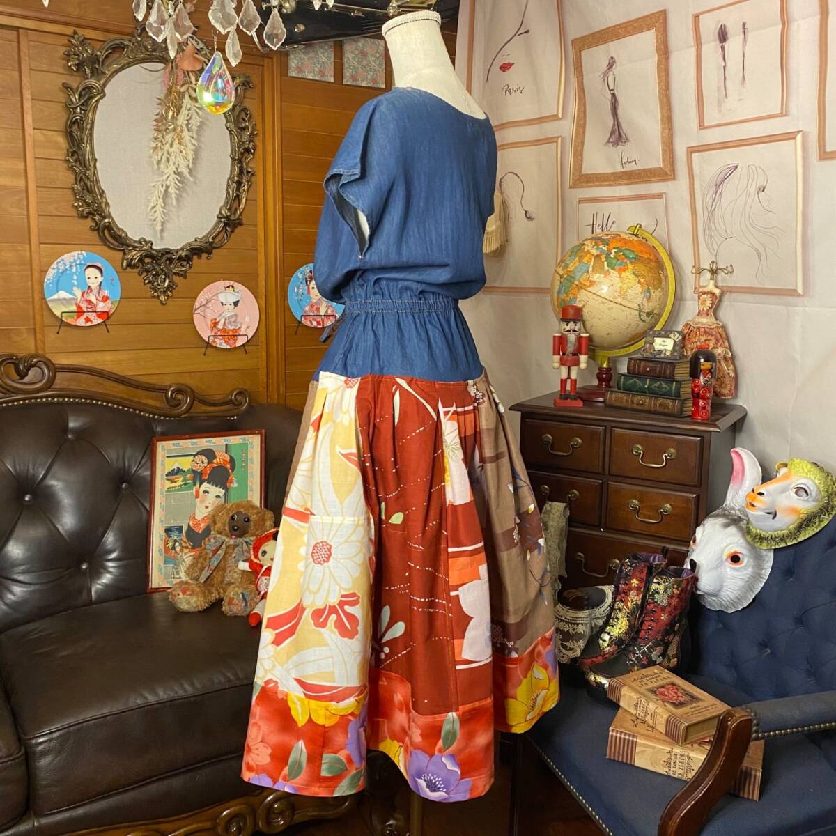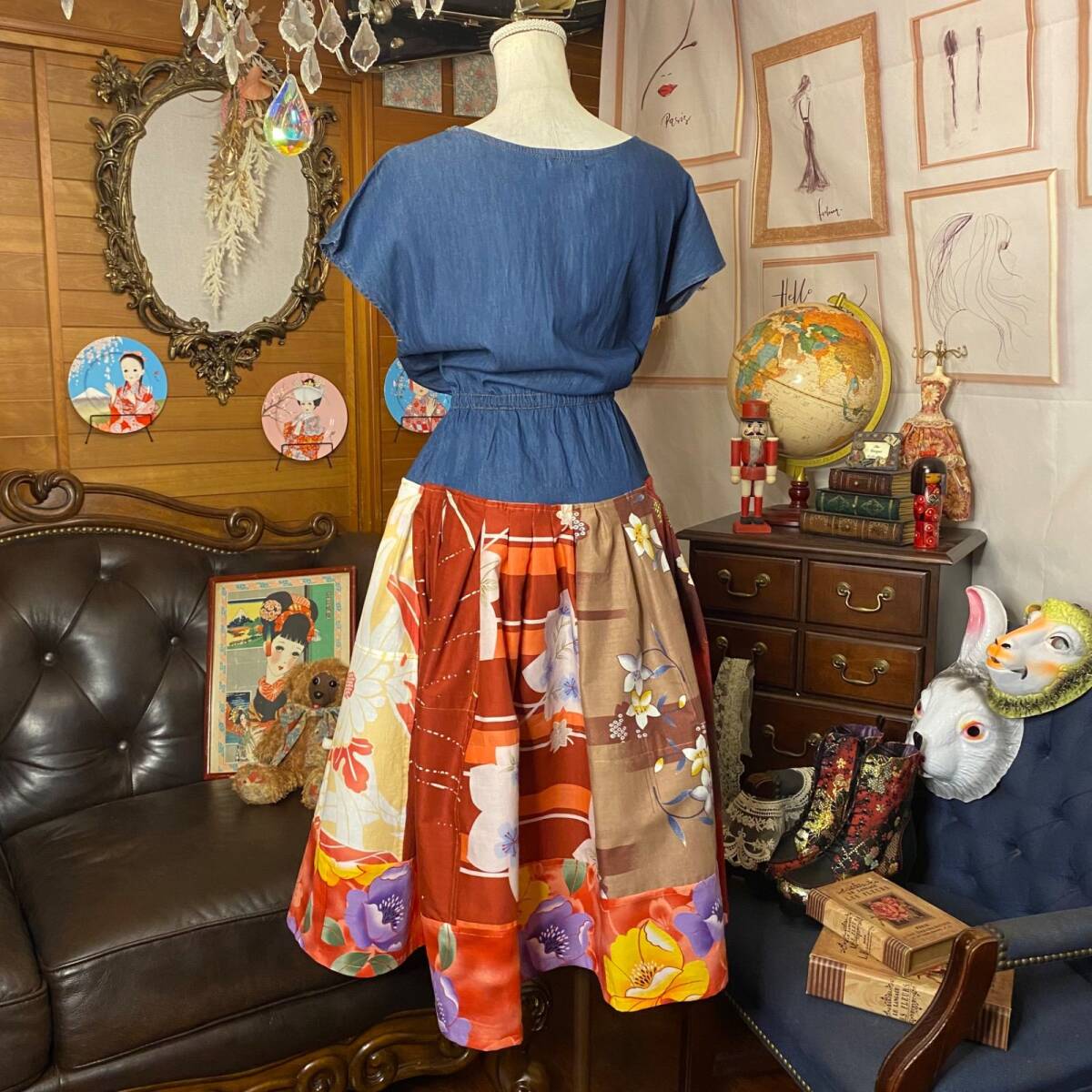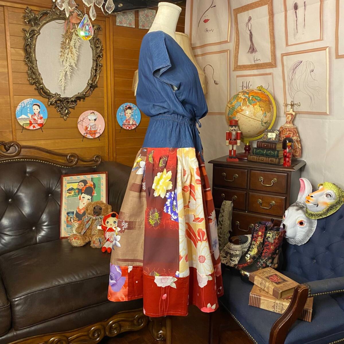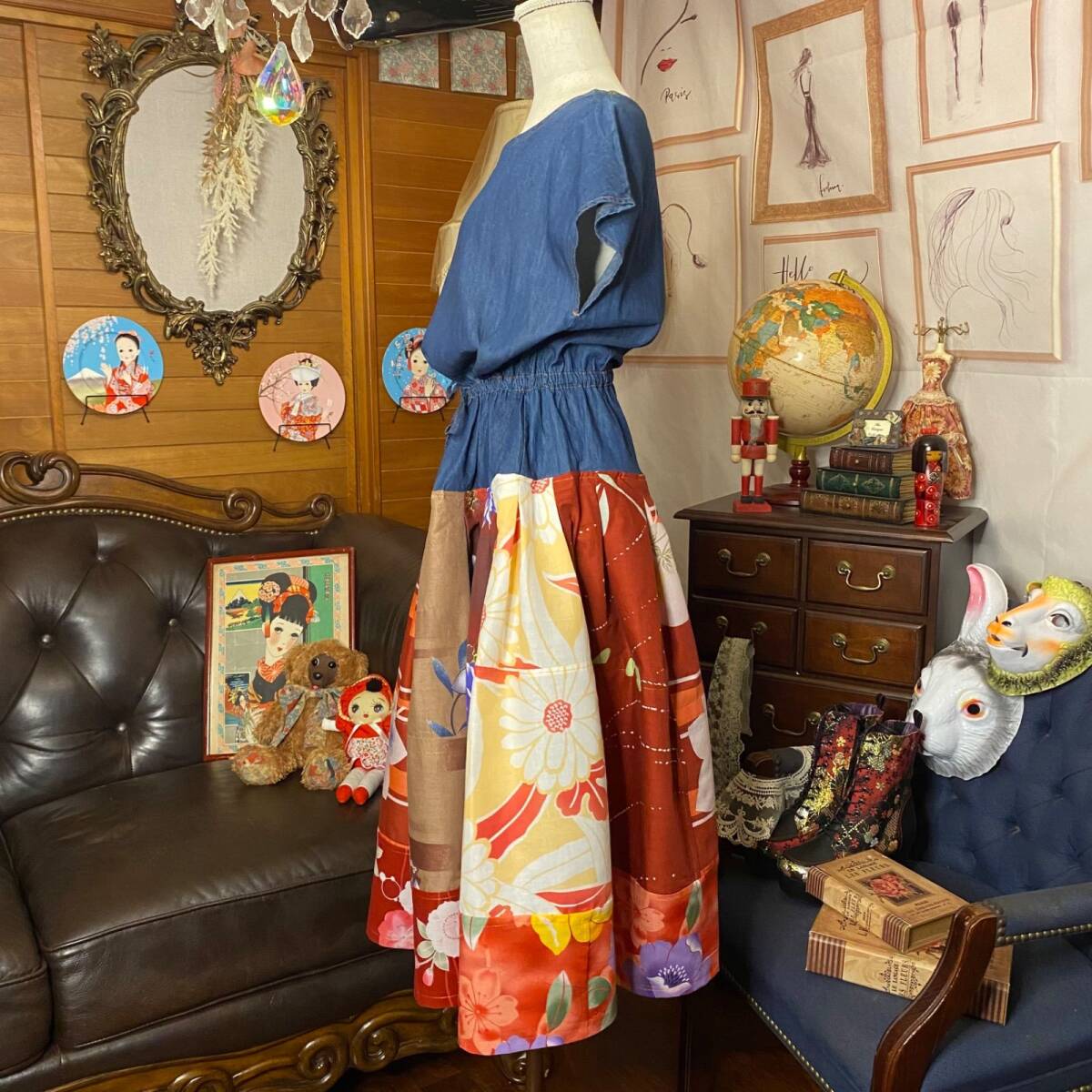 【 和洋折衷 レトロ古着 浴衣 ハンドメイド コラージュ リメイク 和 切り替え ワンピース デニム×赤/レッド系 O-13 】