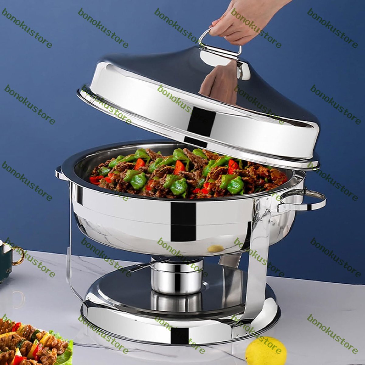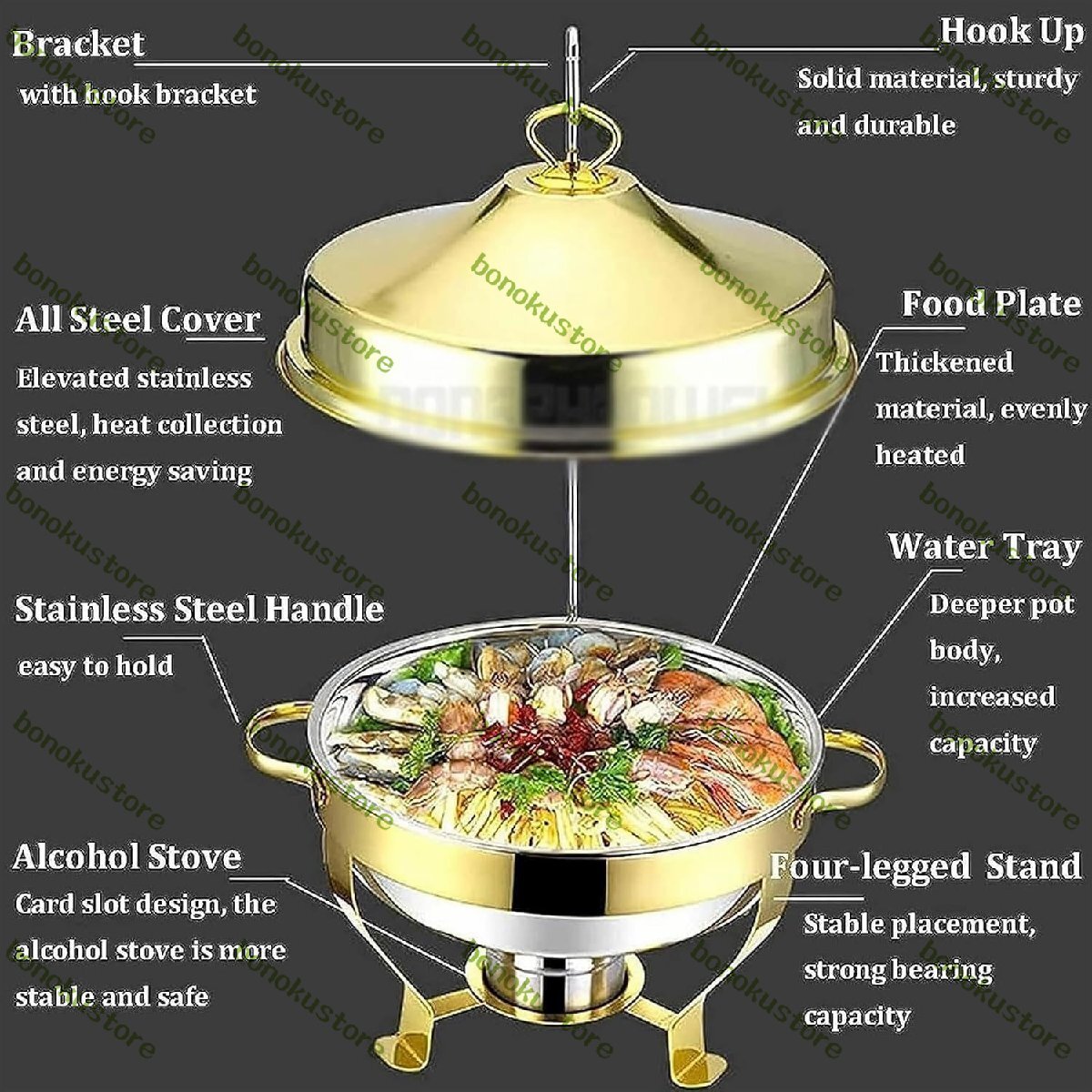優れた素材:フードウォーマーの素材はステンレス鋼で、耐久性があり、高温に耐えるのに十分な安定性があり、変形しにくいです。さらに、シャーシは燃料タンク、フードパン、ウォーターパン、蓋を強力にサポートします。