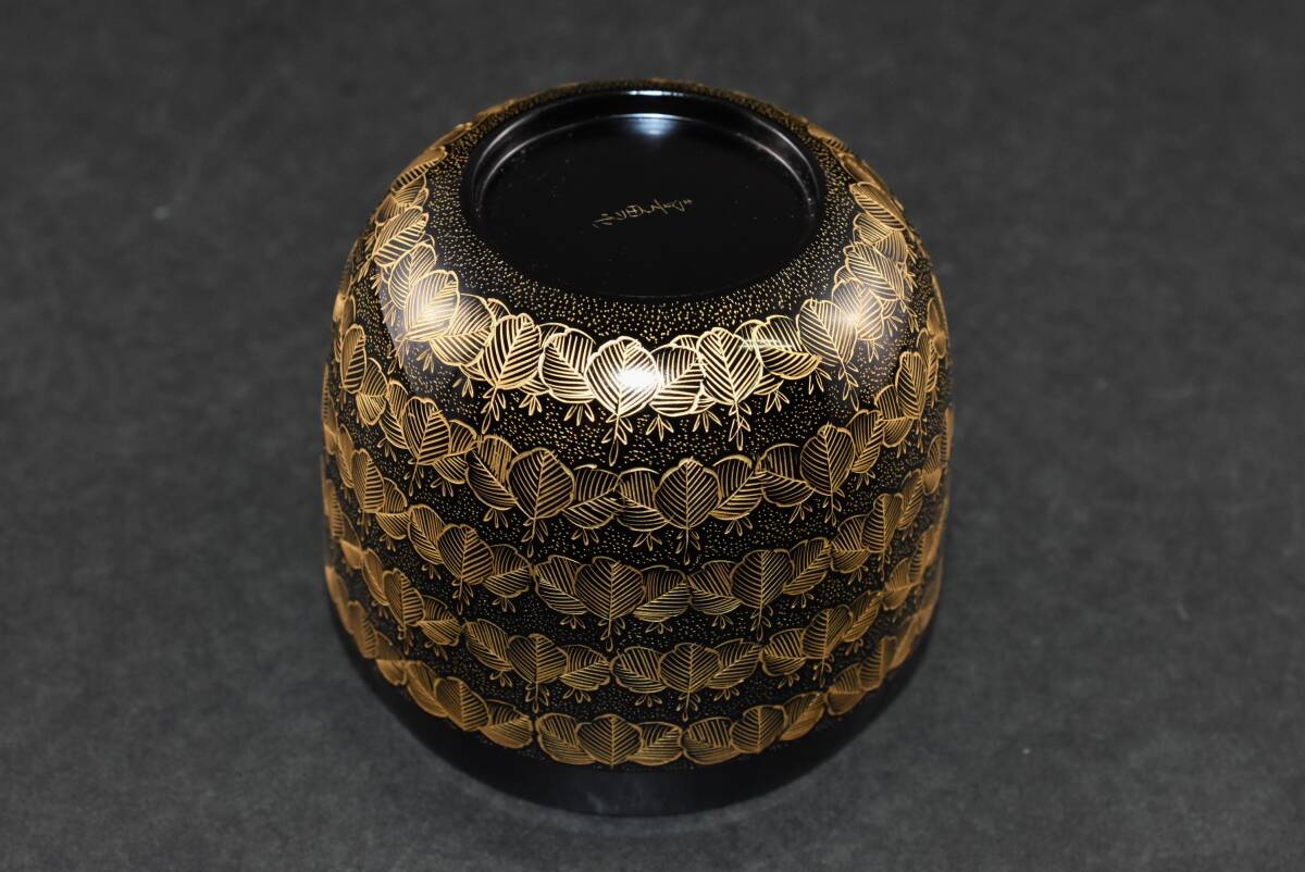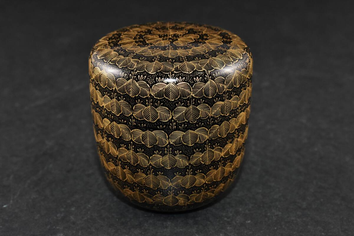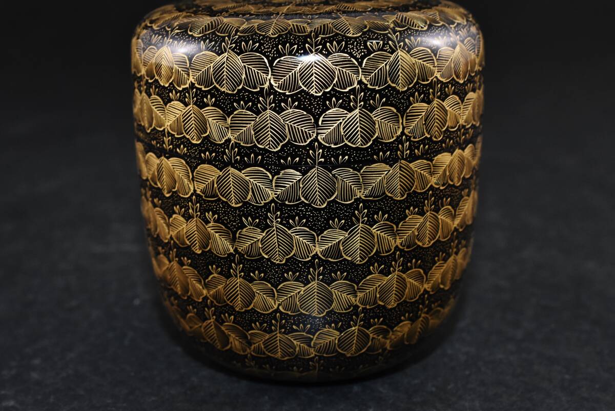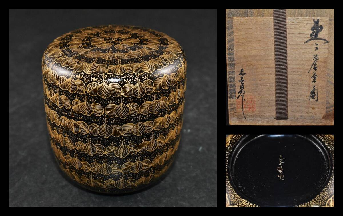 人間国宝、前大峰の甥、前志芸男作の沈金桐文様の中棗です。共箱入りです。