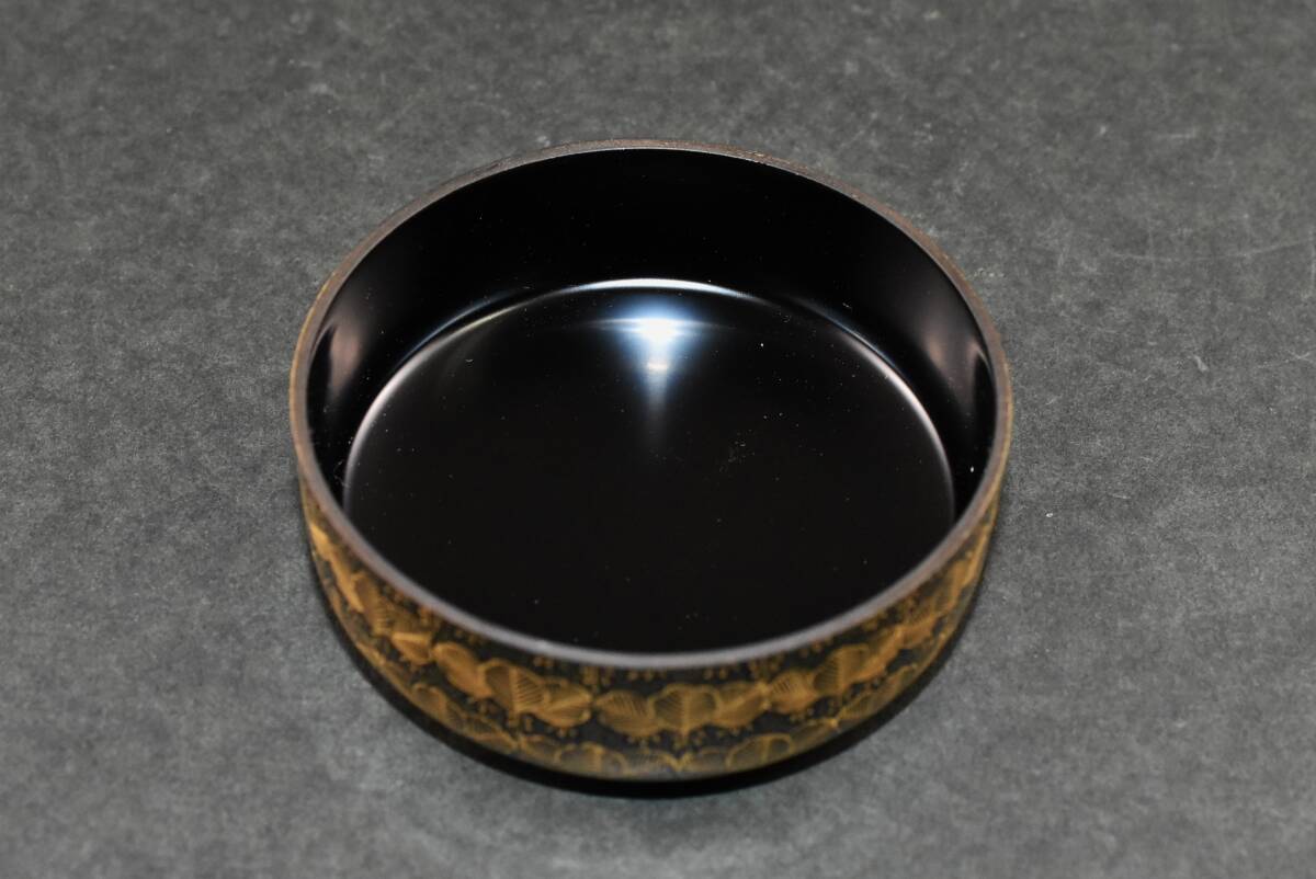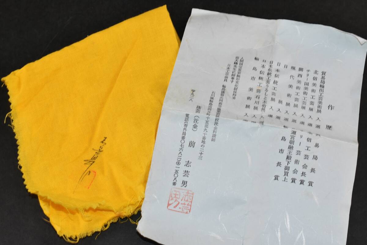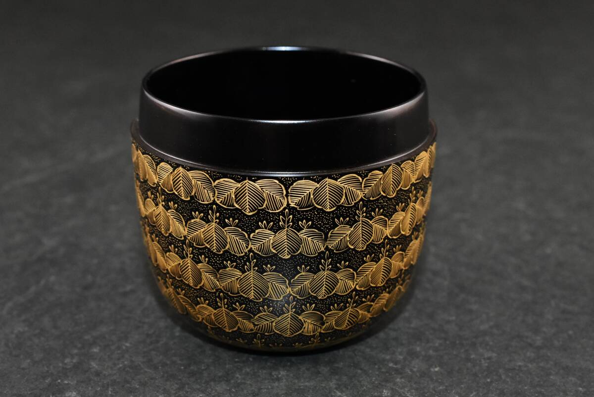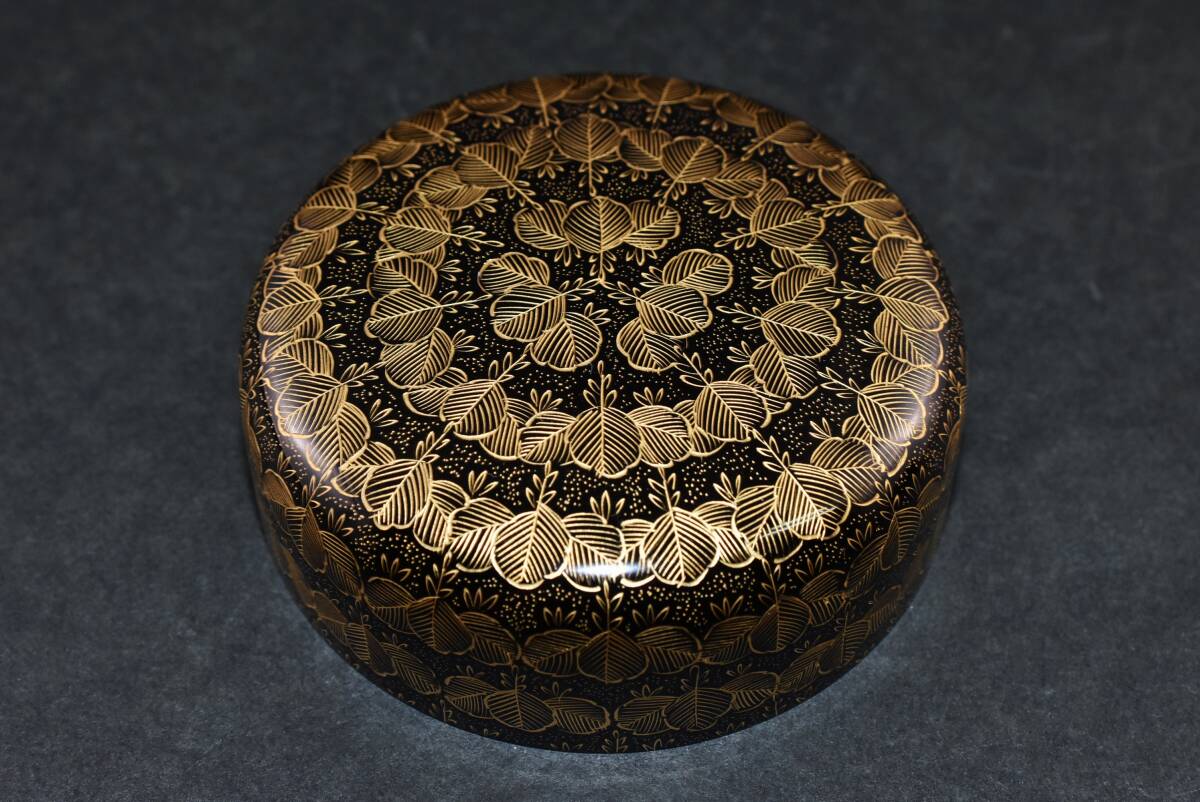 人間国宝、前大峰の甥、前志芸男作の沈金桐文様の中棗です。共箱入りです。