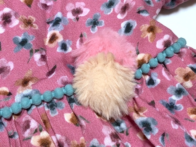 身頃にはふわふわのピンクとベージュのフェイクファーのポンポンがあしらわれ、