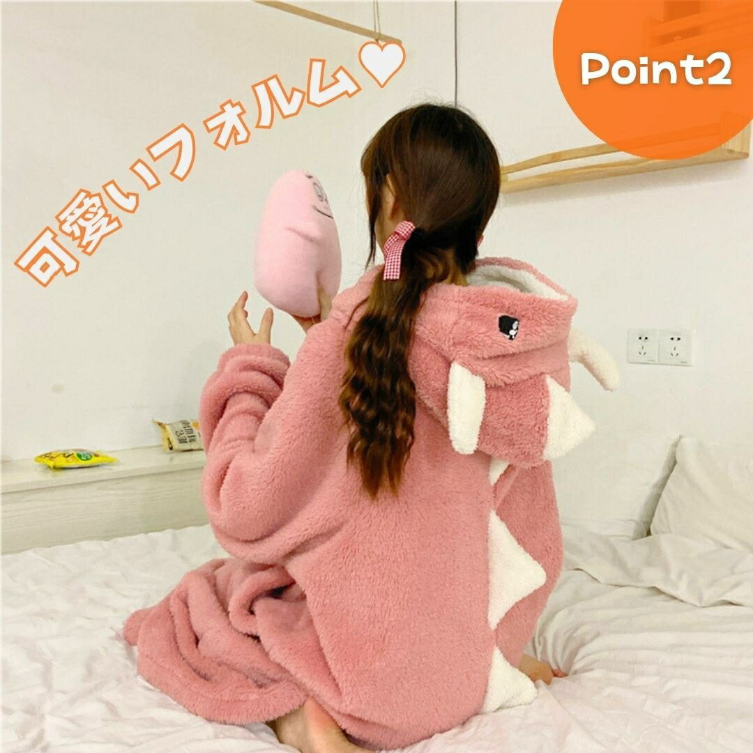 恐竜がモチーフのもこもこあったかのルームウェアとなっております。フード付きで丈が長めに作られているのでお尻の部分もすっぽり入って広範囲で温めてくれます。