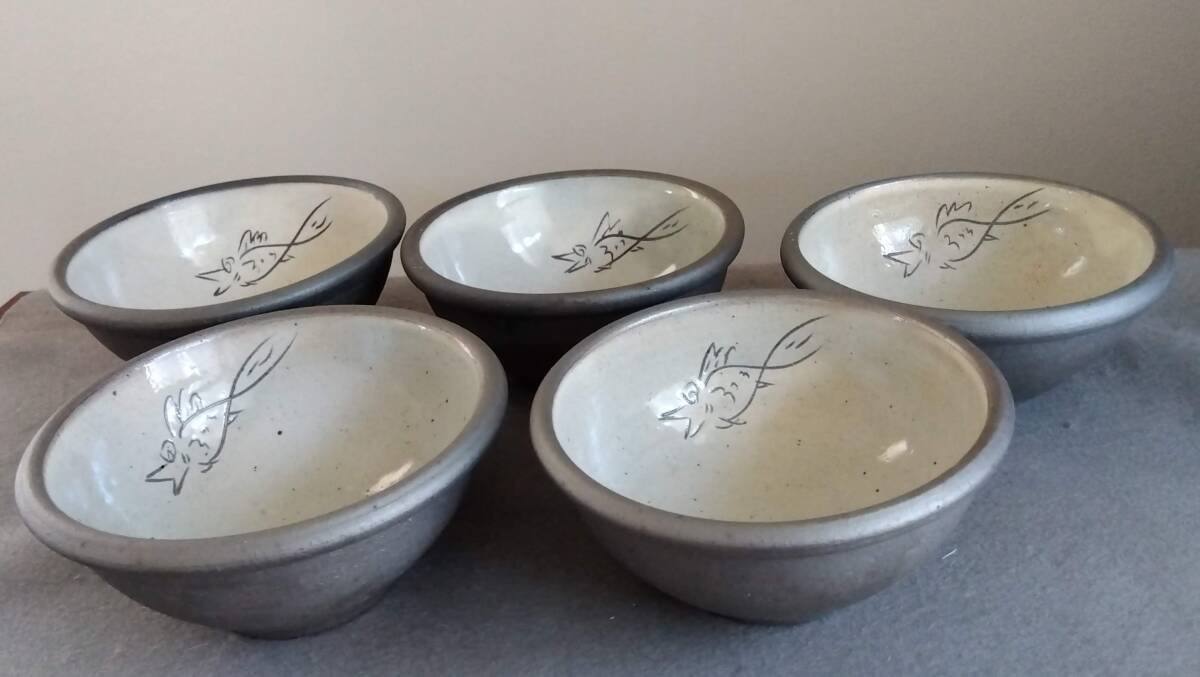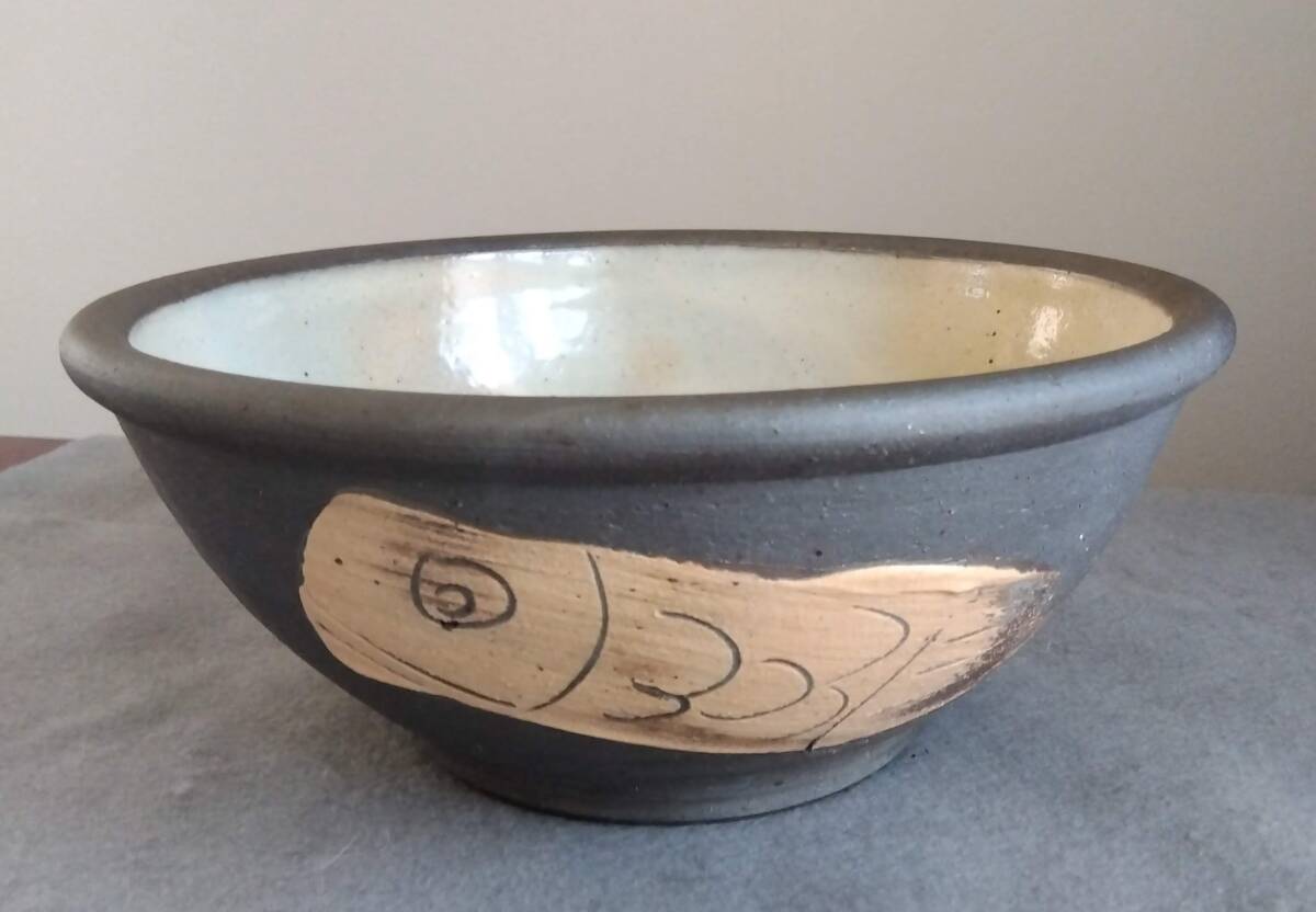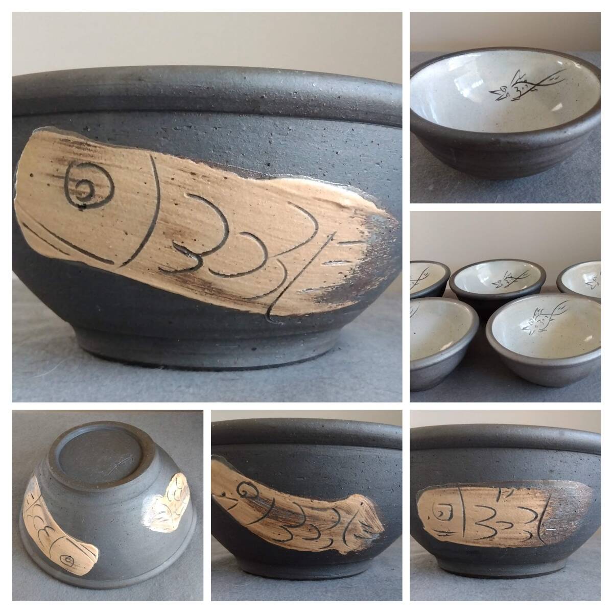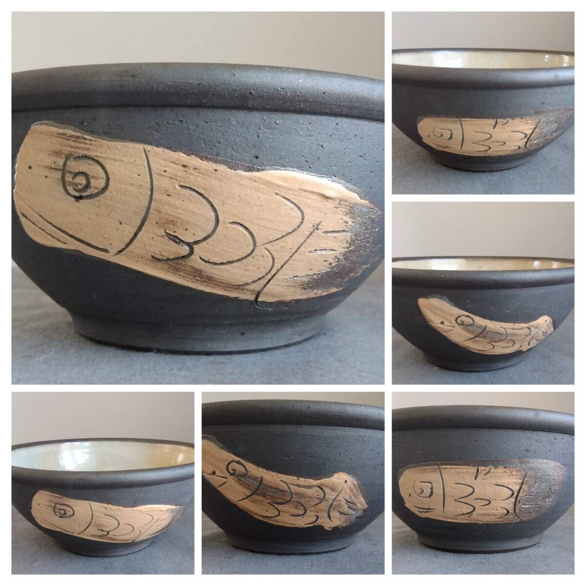 越前焼名工 松井勝彦 【青ノ木窯】 三方魚紋大鉢1点及び小鉢5点のセット 師の芸術審美観がポップモダンで気韻生動 今にも飛び跳ね出てきそうな躍動感野趣溢れる三方魚紋仕様の大鉢と 小鉢見込み部に愛嬌溢れ可愛いく描かれた小魚紋様彫小鉢セットです。 師の芸術審美観が日本伝統陶磁の世界で見事に凝縮された見応えある逸品です。 斬新ポップに描かれたモダニズムポップデザインは 師の造形観審美眼が垣間見られ 日常生活道具としての役割を超えた逸品をご堪能下さい。大鉢サイズ:全高100mm 見込み深90mm 玉縁12mm口径235mm高台厚/径10X95mm 小鉢サイズ:全高67mm 見込み深55mm 玉縁10mm口径150mm高台厚/径5X60mm 出品者覧の【出品中の商品を見る】より 他にも多数の作品を出しておりますので御参照してください。 同梱可能ですので宜しくお願い致します。