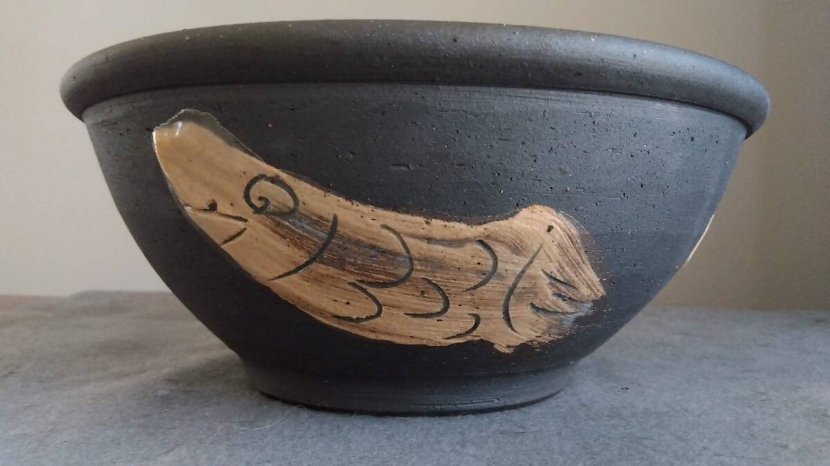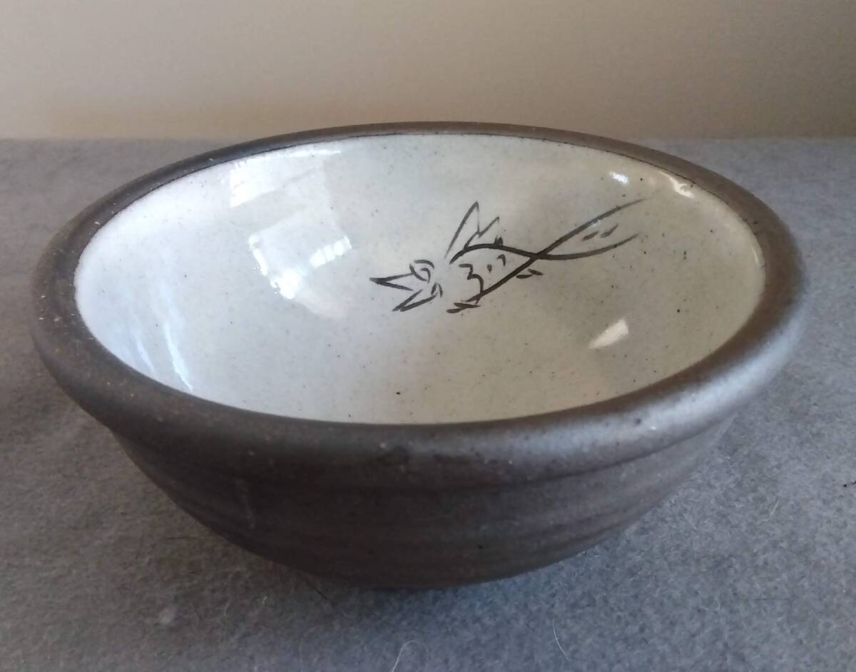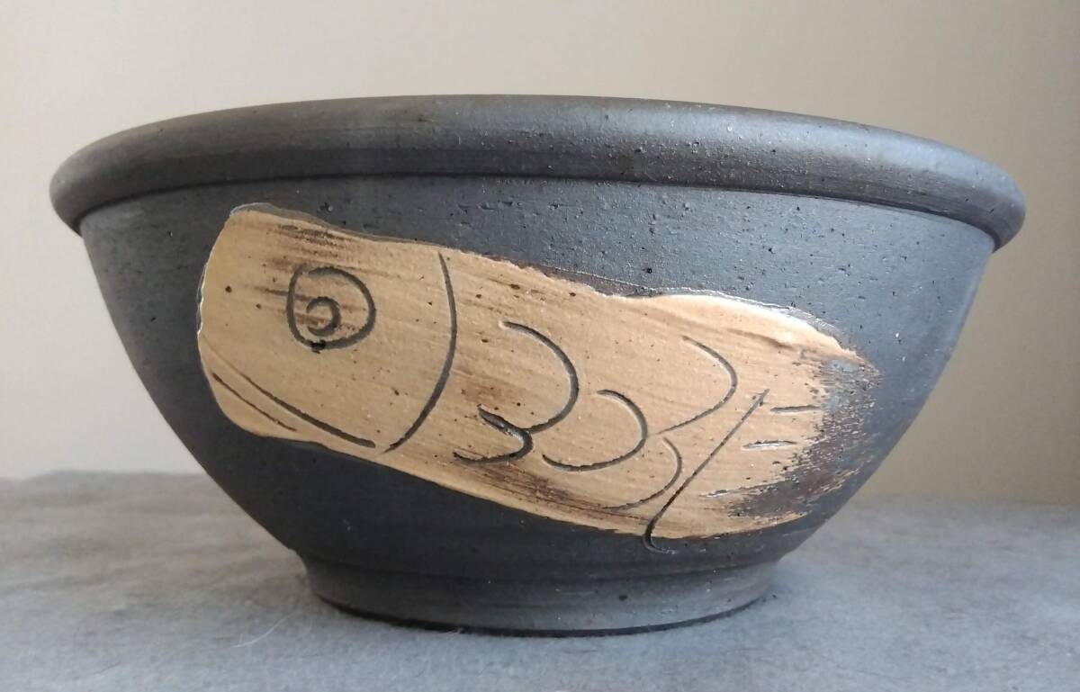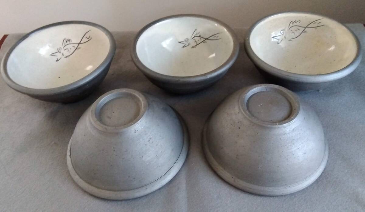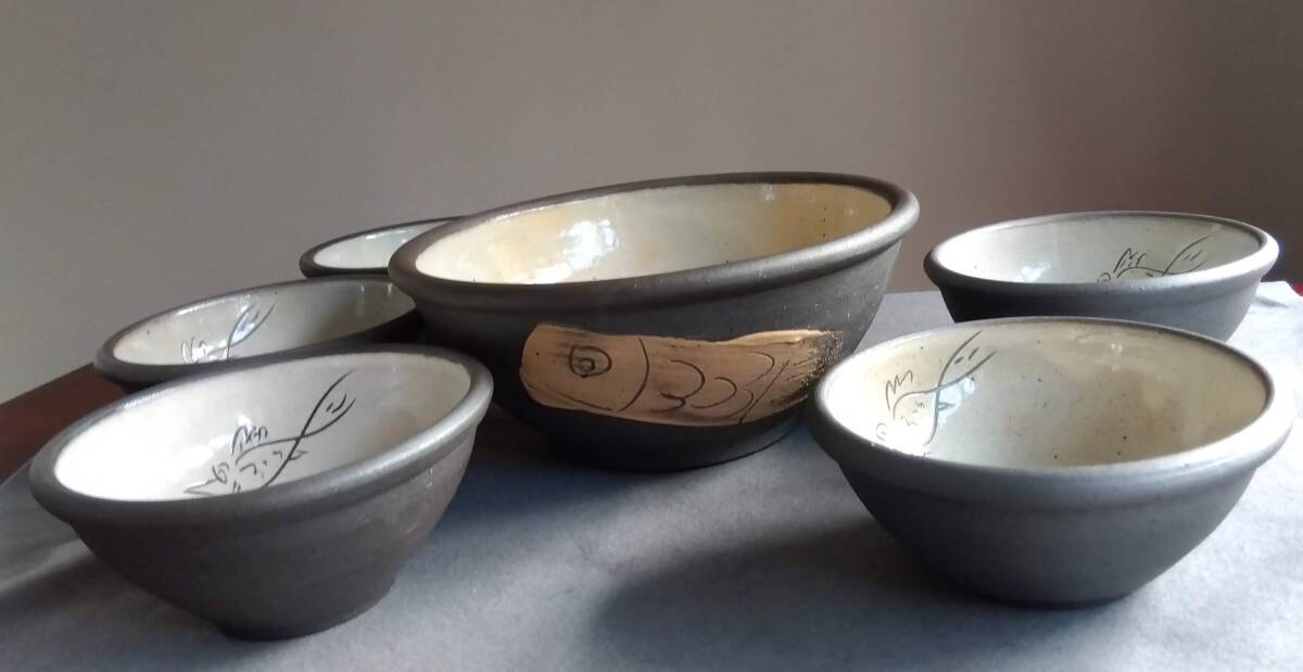 越前焼名工 松井勝彦 【青ノ木窯】 三方魚紋大鉢1点及び小鉢5点のセット 師の芸術審美観がポップモダンで気韻生動 今にも飛び跳ね出てきそうな躍動感野趣溢れる三方魚紋仕様の大鉢と 小鉢見込み部に愛嬌溢れ可愛いく描かれた小魚紋様彫小鉢セットです。 師の芸術審美観が日本伝統陶磁の世界で見事に凝縮された見応えある逸品です。 斬新ポップに描かれたモダニズムポップデザインは 師の造形観審美眼が垣間見られ 日常生活道具としての役割を超えた逸品をご堪能下さい。大鉢サイズ:全高100mm 見込み深90mm 玉縁12mm口径235mm高台厚/径10X95mm 小鉢サイズ:全高67mm 見込み深55mm 玉縁10mm口径150mm高台厚/径5X60mm 出品者覧の【出品中の商品を見る】より 他にも多数の作品を出しておりますので御参照してください。 同梱可能ですので宜しくお願い致します。