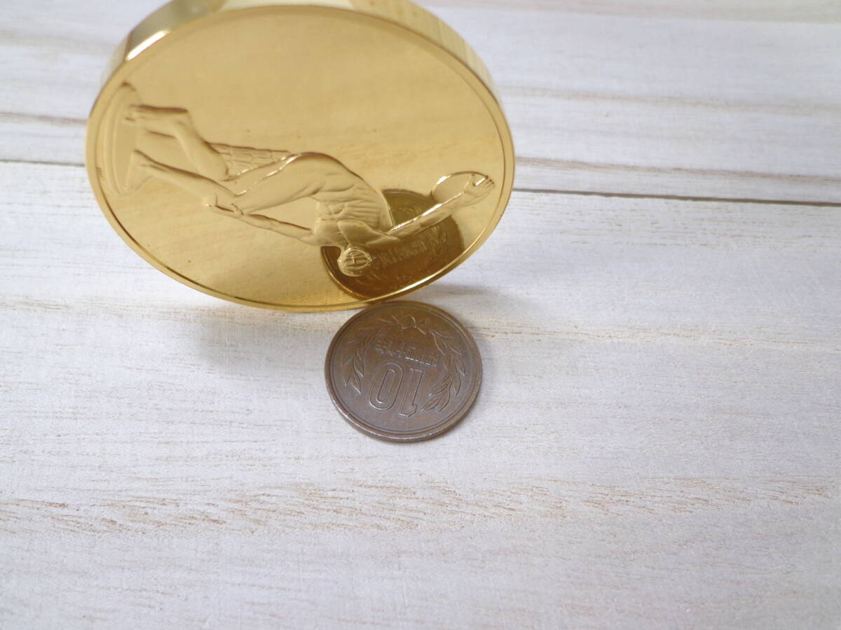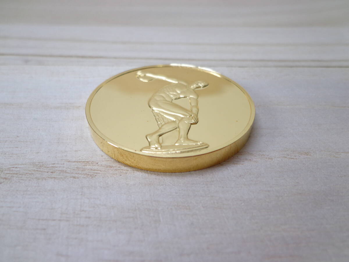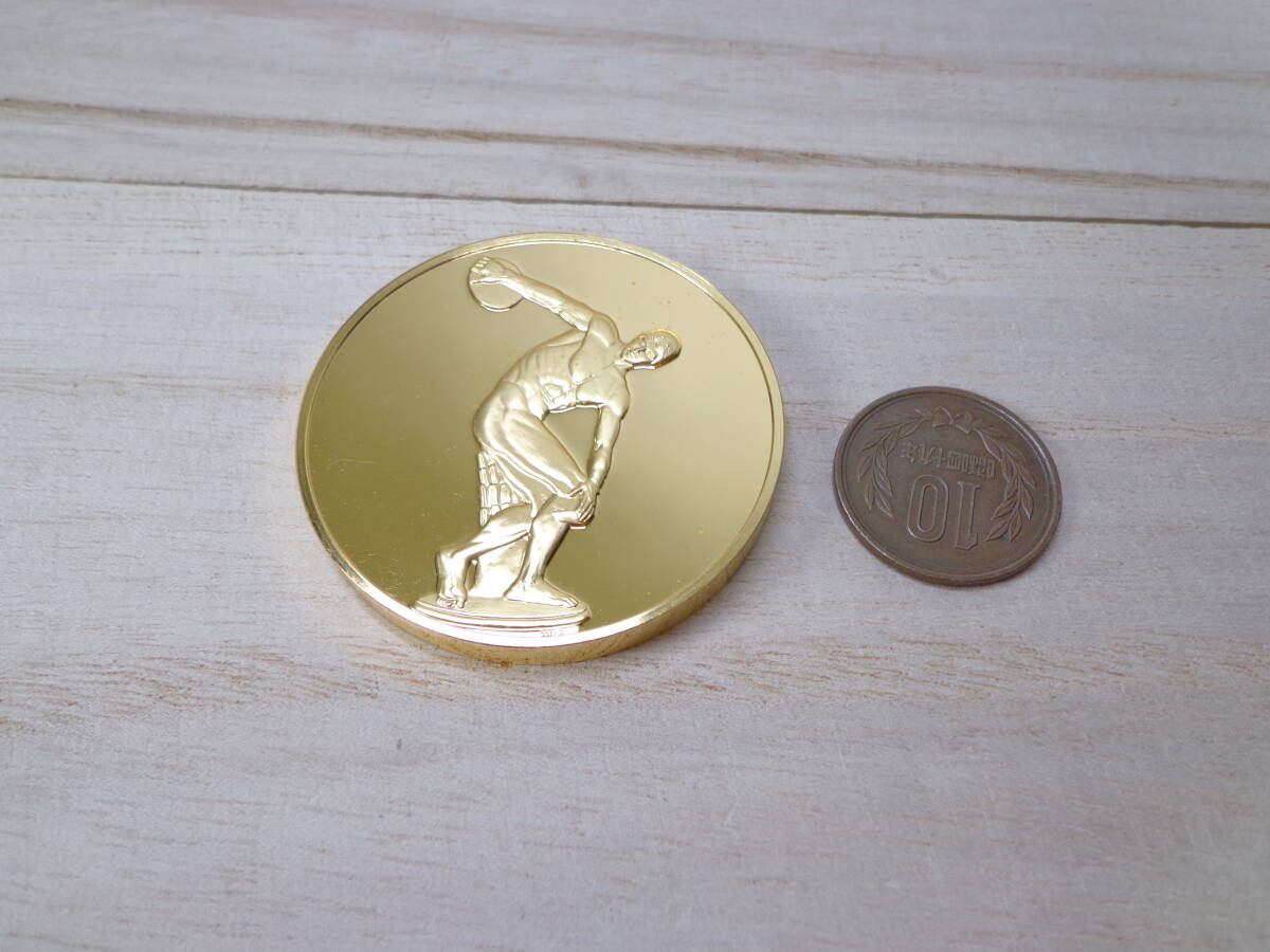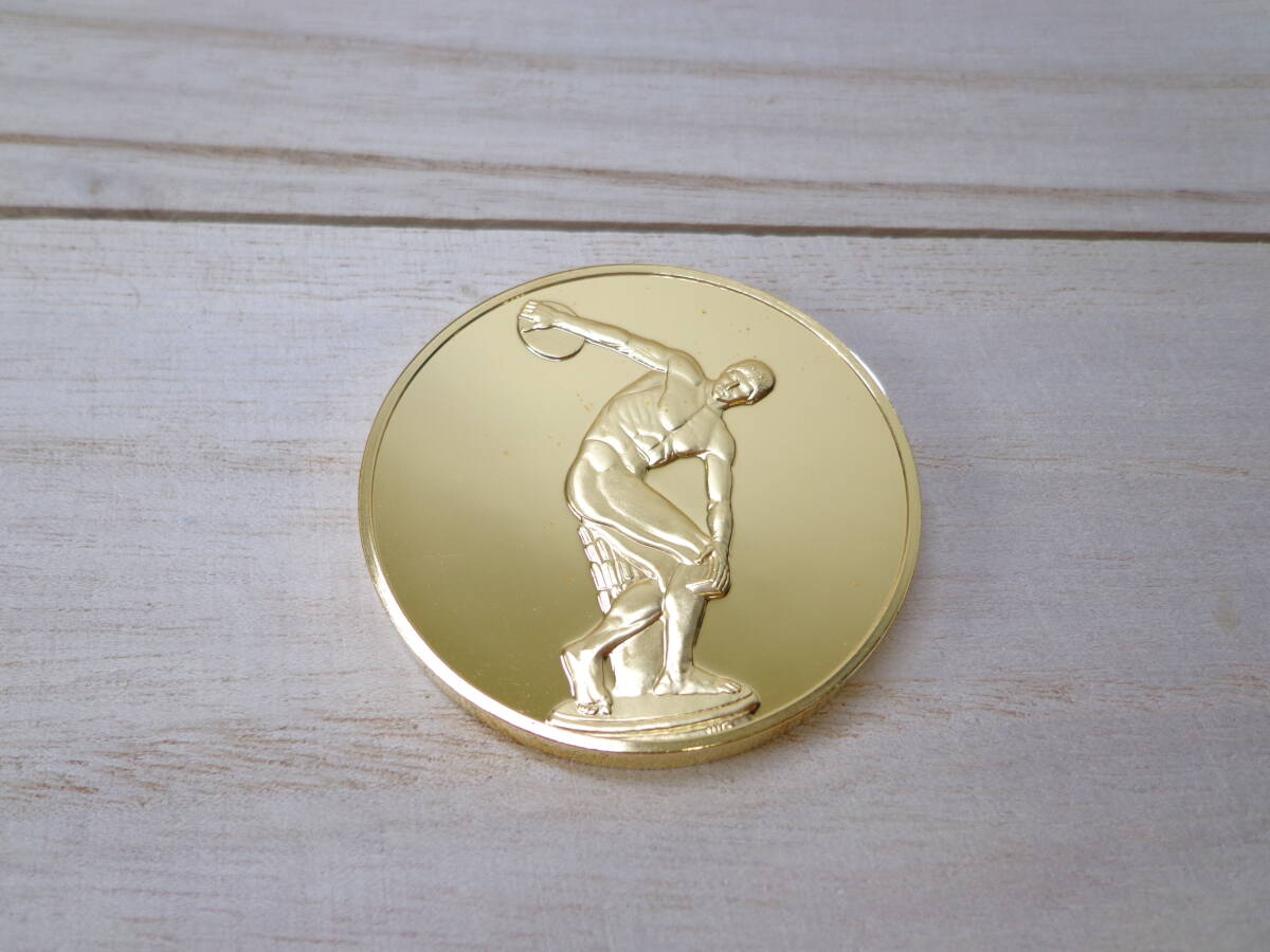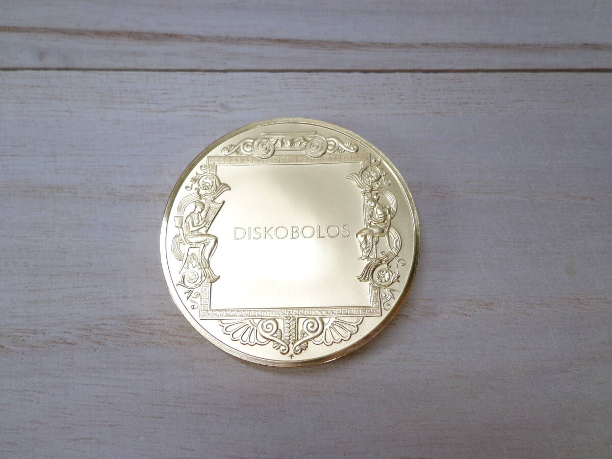 1984年にフランクリンミント社から数量限定で発売されたメダルでして、そのうちの1枚でございます。 紀元前5世紀に作家ミュロンが制作した傑作品で、当時の古代ギリシャ彫刻の発展において画期的な作品となったものでございました。 5.1センチ × 5.1センチ 重さ約80グラム、鏡面仕上げ、純金の美しいメッキのメダルにございます。 40年以上前のものでございますゆえ、表面に変色や若干のスレが認められる箇所がある場合がございますが、深い傷やメッキの剥げなどは見受けられない次第にございます。 純金仕上げのメダルの出品で有りがちな、画像の加工などは一切行っておりませんので、真実の状態を掲載しております。 可能な限り同梱致しますゆえ、ご希望の方はその旨を落札後にメッセージにてお伝えいただきたく存じます。 |