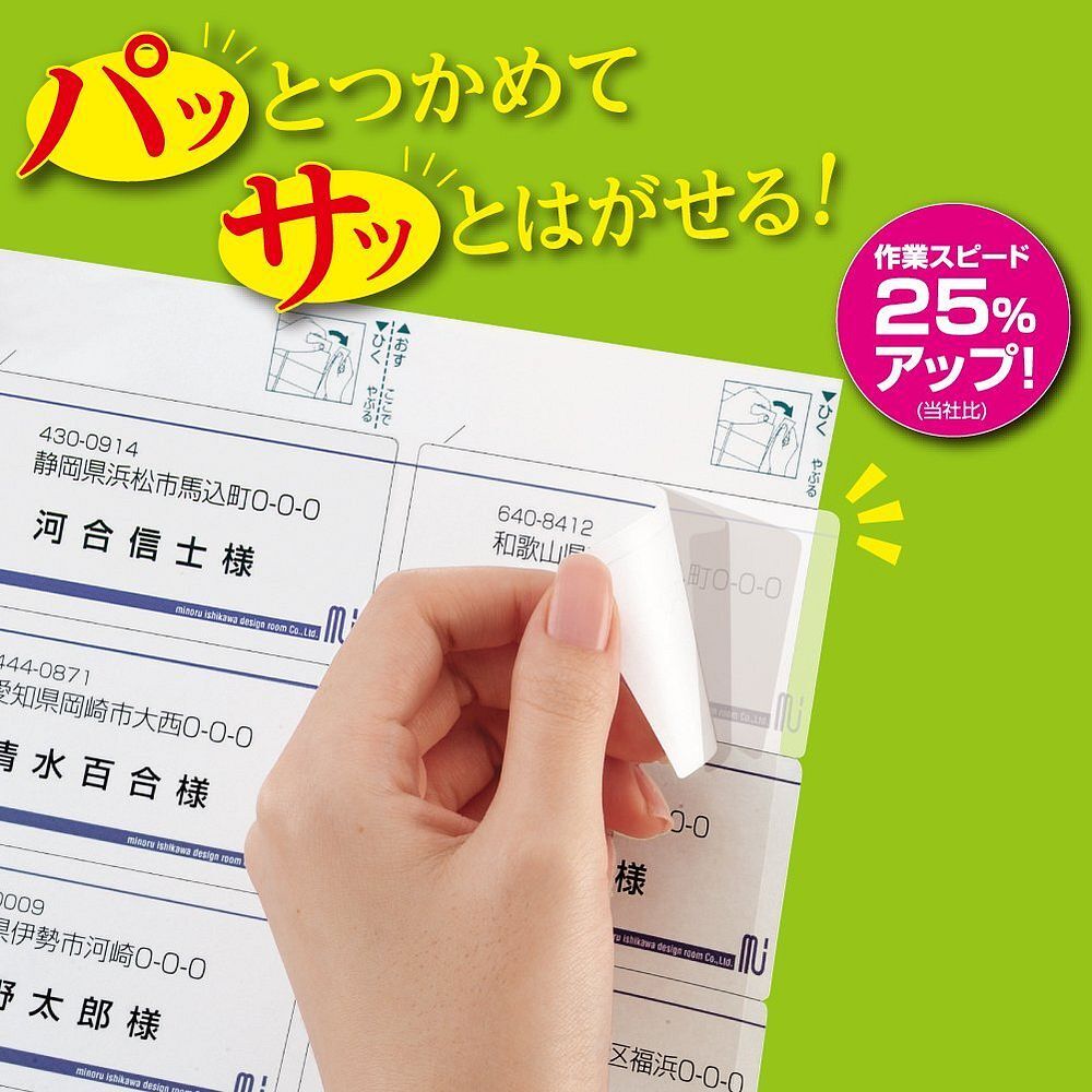 ●ラベル余白部と台紙にミシン目が入っており、切り取るとラベルのつかみしろが一気に現れる「はかどりカット」を採用。大量のラベルを効率よくはがせます。