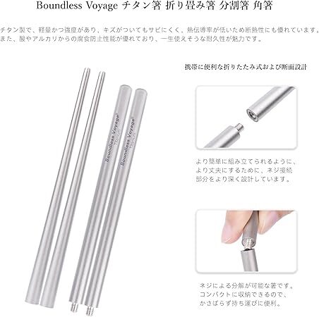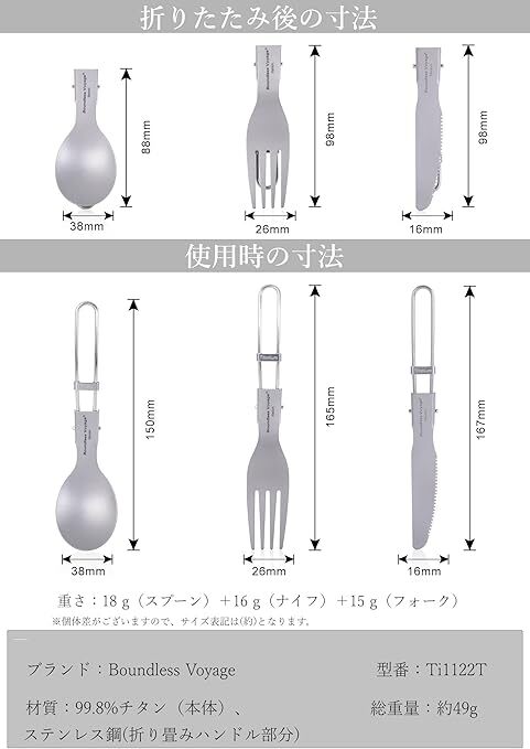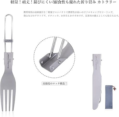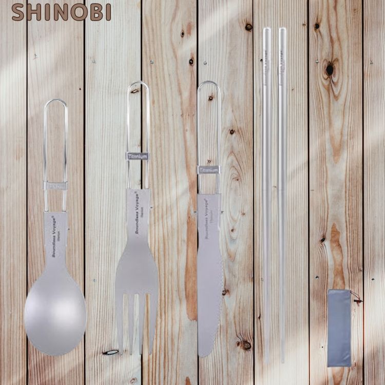 チタン製 スプーン/フォーク/ナイフ/角箸 チタンカトラリー 折りたたみ 超軽量 錆びない 収納袋付き アウトドア キャンプ