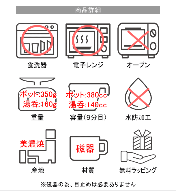 | スリムタイプの湯のみとポットのセットです 白く、ほっこりとした雰囲気の茶器セットは ポットのつまみが茶色で丸く可愛い形 お茶はもちろん、ハーブティーや紅茶などにも使えそうです スリムタイプの湯のみも 手に持ちやすくほっこり馴染み ビールコップで使ってもいい感じ・・。 化粧箱付きで 贈り物にもお勧めです 商品名 : うのはな茶器揃え 商品番号 : kyt2623 ポットのサイズ(cm) : 幅16.5×奥行9×高さ11.5 カップのサイズ : 口径6×高さ10 容量(9分目) : ポット)380cc 湯のみ)140cc 重量 : ポット)350g 湯のみ)160g 材質 : 磁器 使用方法 : 食洗機)〇 オーブン)× 生産国 : 日本(美濃) ※食器洗浄機内に設置する際は、器同士がぶつかると欠けやすい性質があります為、十分にご注意ください ※ディスプレイによる色の違いはご了承下さい -陶器(土物)の特性とお願い- 土物は同じ技法、同じ窯で焼成しても土や釉薬に含まれる天然鉱物などの影響や天候で焼き上がりは微妙に異なります。工業製品のように同一の物になる事はありません。手作りの不均一性、窯変、釉薬の細かいヒビ(貫入)や垂れ等は、製造元より土物の特性として良品の扱いとなります。ご理解頂きお買い求めくださいますようお願い申し上げます |