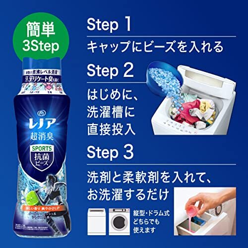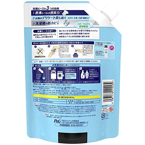 「レノア超消臭抗菌ビーズ スポーツ クールリフレッシュ&シトラスの香りつめかえ用特大 1120mL」▼4987176115539▼(商品説明)・ 旧)詰め替え 1120mL ・冷たい水やスピードコースでもしっかり溶けます・いろいろな柔軟剤とも香りの相性バツグン・香りの量は入れる量で調整できます・縦型とドラム式洗濯機に使えます・ブラント名: レノア説明 商品紹介 従来品^より360mL増量 ^抗菌ビーズ詰替え用760mL衣類の煮沸レベル消臭* 1 *1 洗濯後・部屋干しにて検証 汗、デリケート臭も防ぐ 介護* 2 *2 汗・体臭・尿便臭の成分を使用した模擬実験にて検証。消臭・防臭効果は条件により異なります。すべてのニオイを消臭・防臭できるわけではありません。 抗菌ビーズの3つの効果 洗濯槽の防カビ* 3 も*3 既に付着していたカビや汚れを取り除くわけではありません いろいろな柔軟剤とも香りの相性バツグン 原材料・成分 安定化剤、香料、消臭剤、抗菌剤